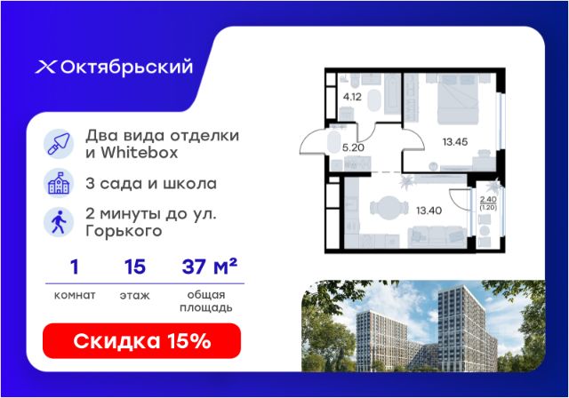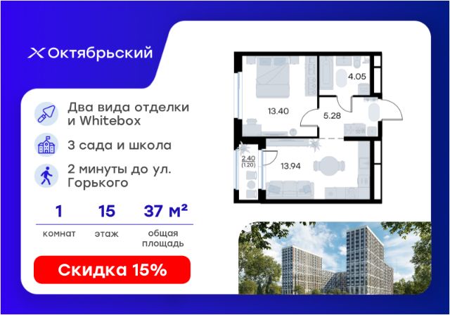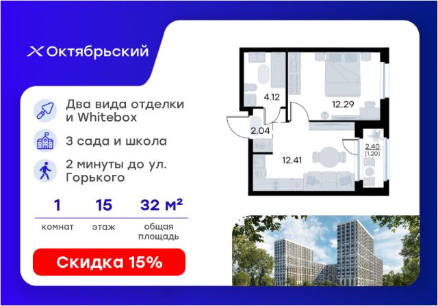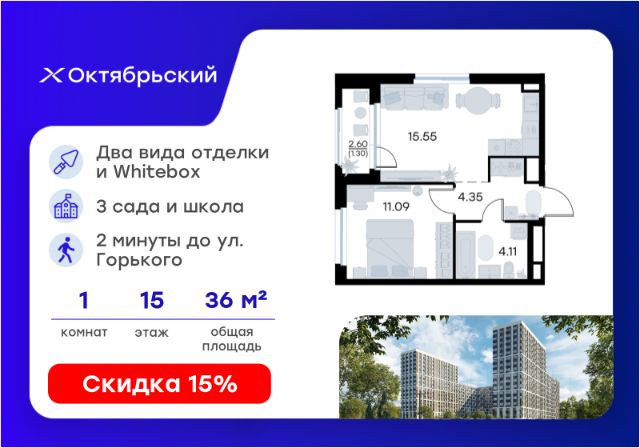 Продается 1-комн. квартира на 15-м этаже в строящемся проекте комфорт-класса Октябрьский. Общая площадь лота составляет 30,88 кв. м, из которых 10,24 кв. м отведено под жилую и 11,37 кв. м под кухонную зону. Номер квартиры - 167. Преимущества квартиры: Высокий этаж; вид на улицу; прямая остекленная лоджия - Собственная коммерческая инфраструктура и комьюнити-центр для жителей - Безопасность на всех уровнях: закрытый двор, видеонаблюдение и система "Умный Дом" - Безбарьерная среда - Дизайнерские остекленные холлы - Просторные колясочные в каждой секции - Эргономичные квартиры с европланировками - Чистовая отделка квартир в 2 стилях на выбор и с дополнительной опцией покраски стен в 4 трендовых цвета на выбор: агатовый серый, серебристо-серый, серый шелк и тонкий лен. - Пешеходный бульвар, площадь с амфитеатром, велодорожки, спортивные и детские площадки, многоуровневые паркинги и "зеленые" дворы. - Строительство трех современных детских садов на 750 детей и проектирование общеобразовательной школы на 1500 учеников Октябрьский — масштабный проект комфорт-класса во Владимире, который расположился в 2-х минутах от ул. Горького. На территории 40 Га появятся 9 очередей жилого строительства с благоустроенными терриориями и концепцией "Тихий двор". 7,31 Га выделено под озеленение. Октябрьский — это комфортная среда обитания, где каждый сантиметр продуман и логичен. Это единое пространство, в которое входят пешеходный бульвар, площадь с амфитеатром, велодорожки, спортивные и детские площадки, многоуровневые паркинги и "зеленые" дворы. Во дворах есть всё для тренировок на свежем воздухе: велодорожки, турники, брусья, площадки для кроссфита и воркаута с мембранным покрытием для круглогодичных занятий. В коммерческих помещениях первых этажей планируется размещение аптек, магазинов, кафе и сервисных центров, необходимых для комфортной жизни. Октябрьский находится в локации с развитой инфраструктурой и хорошей транспортной доступностью. В шаговой доступности расположены остановки общественного транспорта, 3 детских сада, 3 школы и главный корпус Владимирского государственного университета. Отличительное преимущество проекта Октябрьский — видовые квартиры на верхних этажах. Все помещения сдаются уже с предчистовой отделкой. Вы сможете сразу переехать и начать жить в новом доме. Цена указана при 100% оплате или стандартной ипотеке. Узнайте подробности в Отделе продаж.