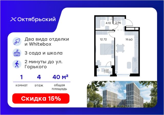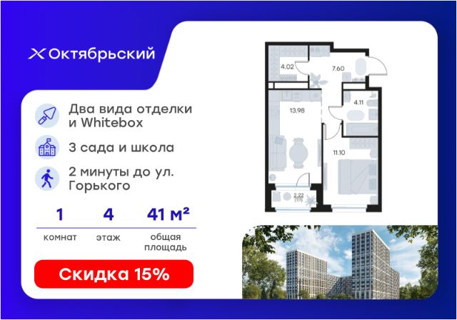 Продается 1-комн. квартира на 4-м этаже в строящемся проекте комфорт-класса Октябрьский. Общая площадь лота составляет 41,92 кв. м, из которых 11,10 кв. м отведено под жилую и 13,98 кв. м под кухонную зону. Номер квартиры - 366. Преимущества квартиры: Европланировка; вид во двор; отделена грязная зона; гардеробная; прямая остекленная лоджия - Собственная коммерческая инфраструктура и комьюнити-центр для жителей - Безопасность на всех уровнях: закрытый двор, видеонаблюдение и система "Умный Дом" - Безбарьерная среда - Дизайнерские остекленные холлы - Просторные колясочные в каждой секции - Эргономичные квартиры с европланировками - Чистовая отделка квартир в 2 стилях на выбор и с дополнительной опцией покраски стен в 4 трендовых цвета на выбор: агатовый серый, серебристо-серый, серый шелк и тонкий лен. - Пешеходный бульвар, площадь с амфитеатром, велодорожки, спортивные и детские площадки, многоуровневые паркинги и "зеленые" дворы. - Строительство трех современных детских садов на 750 детей и проектирование общеобразовательной школы на 1500 учеников Октябрьский — масштабный проект комфорт-класса во Владимире, который расположился в 2-х минутах от ул. Горького. На территории 40 Га появятся 9 очередей жилого строительства с благоустроенными терриориями и концепцией "Тихий двор". 7,31 Га выделено под озеленение. Октябрьский — это комфортная среда обитания, где каждый сантиметр продуман и логичен. Это единое пространство, в которое входят пешеходный бульвар, площадь с амфитеатром, велодорожки, спортивные и детские площадки, многоуровневые паркинги и "зеленые" дворы. Во дворах есть всё для тренировок на свежем воздухе: велодорожки, турники, брусья, площадки для кроссфита и воркаута с мембранным покрытием для круглогодичных занятий. В коммерческих помещениях первых этажей планируется размещение аптек, магазинов, кафе и сервисных центров, необходимых для комфортной жизни. Октябрьский находится в локации с развитой инфраструктурой и хорошей транспортной доступностью. В шаговой доступности расположены остановки общественного транспорта, 3 детских сада, 3 школы и главный корпус Владимирского государственного университета. Отличительное преимущество проекта Октябрьский — видовые квартиры на верхних этажах. Все помещения сдаются уже с предчистовой отделкой. Вы сможете сразу переехать и начать жить в новом доме. Цена указана при 100% оплате или стандартной ипотеке. Узнайте подробности в Отделе продаж. Продается 1-комнатная квартира на 4 этаже в Владимире.