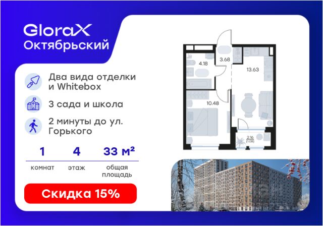 Продается 1-комн. квартира на 3-м этаже в строящемся проекте комфорт-класса GloraX Октябрьский. Общая площадь лота составляет 40,40 кв. м, из которых 12,72 кв. м отведено под жилую и 19,60 кв. м под кухонную зону. Номер квартиры - 457. Преимущества квартиры: Европланировка; вид во двор; прямая остекленная лоджия - Собственная коммерческая инфраструктура и комьюнити-центр для жителей - Безопасность на всех уровнях: закрытый двор, видеонаблюдение и система "Умный Дом" - Безбарьерная среда - Дизайнерские остекленные холлы - Просторные колясочные в каждой секции - Эргономичные квартиры с европланировками - Чистовая отделка квартир в 2 стилях на выбор и с дополнительной опцией покраски стен в 4 трендовых цвета на выбор: агатовый серый, серебристо-серый, серый шелк и тонкий лен. - Пешеходный бульвар, площадь с амфитеатром, велодорожки, спортивные и детские площадки, многоуровневые паркинги и "зеленые" дворы. - Строительство трех современных детских садов на 750 детей и проектирование общеобразовательной школы на 1500 учеников GloraX Октябрьский — масштабный проект комфорт-класса во Владимире, который расположился в 2-х минутах от ул. Горького. На территории 40 Га появятся 9 очередей жилого строительства с благоустроенными терриориями и концепцией "Тихий двор". 7,31 Га выделено под озеленение. GloraX Октябрьский — это комфортная среда обитания, где каждый сантиметр продуман и логичен. Это единое пространство, в которое входят пешеходный бульвар, площадь с амфитеатром, велодорожки, спортивные и детские площадки, многоуровневые паркинги и "зеленые" дворы. Во дворах есть всё для тренировок на свежем воздухе: велодорожки, турники, брусья, площадки для кроссфита и воркаута с мембранным покрытием для круглогодичных занятий. В коммерческих помещениях первых этажей планируется размещение аптек, магазинов, кафе и сервисных центров, необходимых для комфортной жизни. GloraX Октябрьский находится в локации с развитой инфраструктурой и хорошей транспортной доступностью. В шаговой доступности расположены остановки общественного транспорта, 3 детских сада, 3 школы и главный корпус Владимирского государственного университета. Отличительное преимущество GloraX Октябрьский — видовые квартиры на верхних этажах. Все помещения сдаются уже с предчистовой отделкой. Вы сможете сразу переехать и начать жить в новом доме. Цена указана при 100% оплате или стандартной ипотеке. Узнайте подробности в Отделе продаж. 1-комнатная квартира в новостройке без отделки в Владимире.