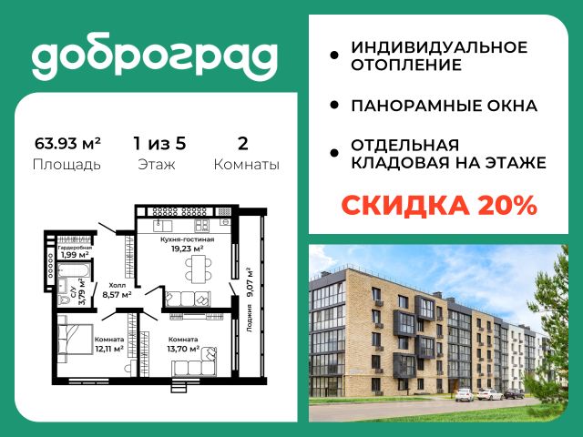 Продается 2-к квартира 64.50 кв.м. С ОТДЕЛКОЙ WHITE BOX в новом уже построенном доме по адресу: Владимирская область, Доброград, улица Удачная, д.7 корп.2 . Дом монолитно-блочный, в квартире предусмотрено индивидуальное отопление двухконтурным газовым котлом. ДОМ СДАН! Квартира находится на 1 этаже 5-этажного дома. На лестничной площадке предусмотрена собственная кладовая комната (келлер) для хранения вещей. В доме есть лифт, просторные входные группы, организован безбарьерный вход в подъезд. Функциональная планировка, большая кухня-гостиная, эффектная лоджия с панорамным остеклением, гардеробная помогут грамотно организовать пространство. Отделка квартиры включает в себя: - пол - полусухая стяжка, - стены подготовлены под поклейку обоев, - электроразводка, выводы для освещения, - разводка сантехнических и водопроводных труб, канализации, - ванная - гидроизоляция пола, штукатурка стен, - откосы из ГВЛ, подоконники из ПВХ, - лоджия - выводы для освещения, розетки и выключателя. Рядом расположен живописный природный парк, озеро, места для отдыха и прогулок, качественные игровые площадки. Доброград - это превосходная экология и современная инфраструктура всего в 2,5 часах от Москвы. В городе работает современный образовательный комплекс "МИР" (частная школа и детский сад), муниципальная гимназия. В 2026 году состоится открытие государственного детского сада и физкультурно-оздоровительного комплекса с бассейном. Медицинское обслуживание обеспечивает Первый клинический медицинский центр, расположенный в 12 километрах от Доброграда, а в самом Доброграде работает кабинет врача общей практики. Территория охраняется, въезд строго по пропускам, что гарантирует безопасность Вам и Вашей семье. В Доброграде организованы необходимые условия для занятий спортом круглый год: - оборудованные площадки для самых популярных видов спорта, - крытый спортивный комплекс, - первое в регионе 9-луночное гольф-поле, - скейт-парк, - веревочный парк, - освещенные лыжные и велосипедные трассы, - крупнейший в Европе вейк-парк. Город обслуживает собственная управляющая компания, которая обеспечивает бесперебойную работу всех систем, чистоту и порядок на территории. Стоимость в объявлении указана со скидкой, скидка предоставляется при условии единовременной полной оплаты или покупки в ипотеку. Квартиру можно приобрести за наличную оплату, в ипотеку, а также с рассрочкой от застройщика. Условия ипотеки и рассрочки уточняйте у менеджеров отдела продаж.