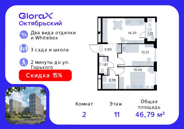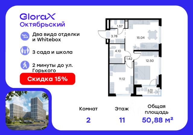 Продается 2-комн. квартира на 11-м этаже в строящемся проекте комфорт-класса GloraX Октябрьский. Общая площадь лота составляет 48,05 кв. м, из которых 22,88 кв. м отведено под жилую и 13,88 кв. м под кухонную зону. Номер квартиры - 562. Преимущества квартиры: Европланировка; вид на улицу; прямая остекленная лоджия - Собственная коммерческая инфраструктура и комьюнити-центр для жителей - Безопасность на всех уровнях: закрытый двор, видеонаблюдение и система "Умный Дом" - Безбарьерная среда - Дизайнерские остекленные холлы - Просторные колясочные в каждой секции - Эргономичные квартиры с европланировками - Чистовая отделка квартир в 2 стилях на выбор и с дополнительной опцией покраски стен в 4 трендовых цвета на выбор: агатовый серый, серебристо-серый, серый шелк и тонкий лен. - Пешеходный бульвар, площадь с амфитеатром, велодорожки, спортивные и детские площадки, многоуровневые паркинги и "зеленые" дворы. - Строительство трех современных детских садов на 750 детей и проектирование общеобразовательной школы на 1500 учеников GloraX Октябрьский — масштабный проект комфорт-класса во Владимире, который расположился в 2-х минутах от ул. Горького. На территории 40 Га появятся 9 очередей жилого строительства с благоустроенными терриориями и концепцией "Тихий двор". 7,31 Га выделено под озеленение. GloraX Октябрьский — это комфортная среда обитания, где каждый сантиметр продуман и логичен. Это единое пространство, в которое входят пешеходный бульвар, площадь с амфитеатром, велодорожки, спортивные и детские площадки, многоуровневые паркинги и "зеленые" дворы. Во дворах есть всё для тренировок на свежем воздухе: велодорожки, турники, брусья, площадки для кроссфита и воркаута с мембранным покрытием для круглогодичных занятий. В коммерческих помещениях первых этажей планируется размещение аптек, магазинов, кафе и сервисных центров, необходимых для комфортной жизни. GloraX Октябрьский находится в локации с развитой инфраструктурой и хорошей транспортной доступностью. В шаговой доступности расположены остановки общественного транспорта, 3 детских сада, 3 школы и главный корпус Владимирского государственного университета. Отличительное преимущество GloraX Октябрьский — видовые квартиры на верхних этажах. Все помещения сдаются уже с предчистовой отделкой. Вы сможете сразу переехать и начать жить в новом доме. Цена указана при 100% оплате или стандартной ипотеке. Узнайте подробности в Отделе продаж.