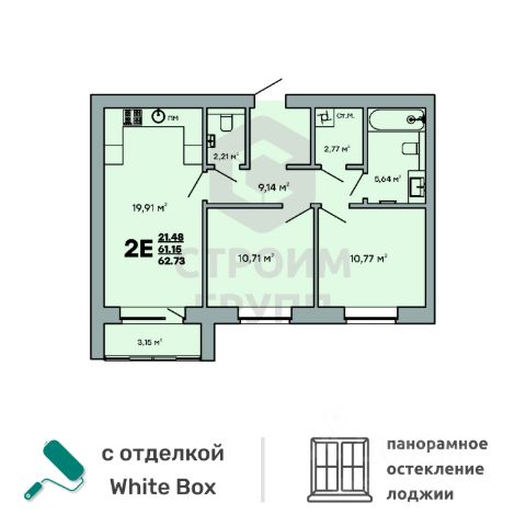 Особенностью этой двухкомнатной квартиры является объединенная с кухней гостиная общей площадью почти 20 квадратных метров! Помещение разделено на зоны для приготовления пищи, где можно установить кухонный гарнитур и большой обеденный стол для всей семьи, и ТВ-зону, где поместится хороший просторный диван. Из комнаты имеется выход на просторную лоджию площадью 3,15 квадратных метра. При сдаче дома лоджия будет остеклена! При такой планировке совмещенной кухни и гостиной, неоспоримым преимуществом этой двухкомнатной квартиры являются две отдельные комнаты площадью почти 11 квадратных метров каждая. Одну из них можно использовать под спальную комнату с размещением там широкой кровати или раскладного дивана. Предусмотрено место под вместительный шкаф для одежды. Вторую комнату можно использовать в качестве детской или кабинета. Интересным и полезным решением в этой двухкомнатной квартире стали два санузла! Один - полноценный, площадью 5,6 квадратных метра, где можно установить раковину, ванну и стиральную машину, а второй - небольшой, площадью 2,2 квадратных метра, с отдельными унитазом и раковиной. Для семьи с детьми - очень актуальное решение. Обратите внимание - рядом с большим санузлом есть отдельное помещение площадью почти 2,8 квадратных метра, которое можно использовать в качестве постирочной комнаты или гардероба. Просторная прихожая является непроходной. Изолированность прихожей позволяет держать в чистоте остальные помещения квартиры грязь с улицы не будет разноситься по комнатам. Доступны такие способы покупки, как наличные, ипотека от ведущих банков (в т.ч. все программы с субсидиями и господдержка), ипотека со снижением ставки за счёт застройщика, рассрочка до 2 лет напрямую от застройщика. В цену квартиры сразу входит ремонт в формате White Box с гарантией на все работы!