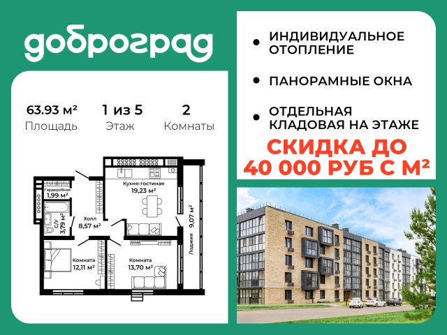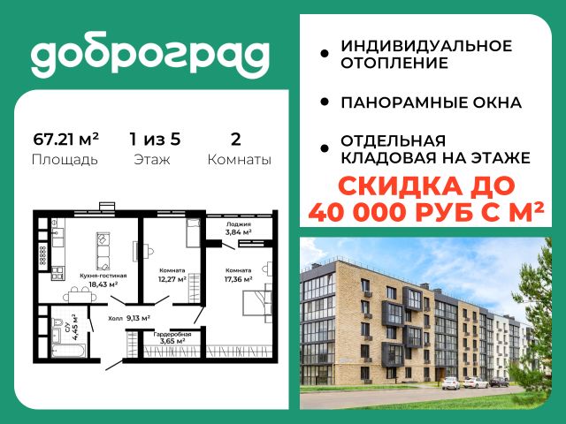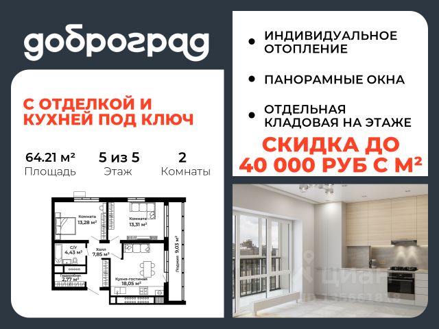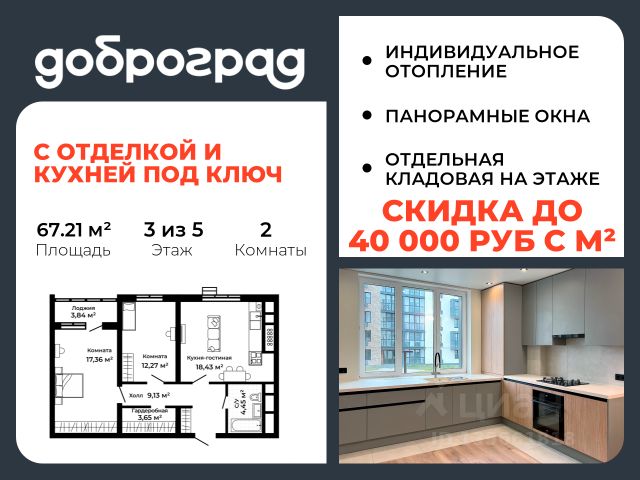 Продается 2-к квартира 67.21 кв.м. с полной ЧИСТОВОЙ ОТДЕЛКОЙ И КУХНЕЙв новом построенном доме по адресу: Владимирская область, Доброград, улица Благополучия, д.2 корп.2. Дом монолитно-блочный, в квартире предусмотрено индивидуальное отопление двухконтурным газовым котлом. ДОМ СДАН! Квартира находится на 3 этаже 5-этажного дома. На лестничной площадке предусмотрена собственная кладовая комната (келлер) для хранения вещей. В доме есть лифт, просторные входные группы, организован безбарьерный вход в подъезд. Функциональная планировка, большая кухня-гостиная, эффектная лоджия с панорамным остеклением, гардеробная помогут грамотно организовать пространство. Отделка квартиры включает в себя: - пол - керамогранит/ламинат, в санузле предусмотрен теплый пол; - стены - покраска, в санузле - керамогранит; - бесщелевые натяжные потолки со встроенными и подвесными светильниками; - акриловая ванна с душевым ограждением, унитаз подвесной с инсталляцией, смесители, душевая система, раковина с тумбой, полотенцесушитель, зеркало с подсветкой, вентилятор; - выключатели и розетки; - кухонный гарнитур с врезной мойкой и смесителем, холодильник встроенный, варочная панель, духовой шкаф встроенный, вытяжка встроенная, посудомоечная машина встроенная; - кондиционер; - межкомнатные двери скрытого монтажа; - отделка лоджии, включая освещение и установку розетки. Рядом расположен живописный природный парк, озеро, места для отдыха и прогулок, качественные игровые площадки. Доброград - это превосходная экология и современная инфраструктура всего в 2,5 часах от Москвы. В городе работает современный образовательный комплекс "МИР" (частная школа и детский сад), муниципальная гимназия. В 2026 году состоится открытие государственного детского сада и физкультурно-оздоровительного комплекса с бассейном. Медицинское обслуживание обеспечивает Первый клинический медицинский центр, расположенный в 12 километрах от Доброграда, а в самом Доброграде работает кабинет врача общей практики. Территория охраняется, въезд строго по пропускам, что гарантирует безопасность Вам и Вашей семье. В Доброграде организованы необходимые условия для занятий спортом круглый год: - оборудованные площадки для самых популярных видов спорта, - крытый спортивный комплекс, - первое в регионе 9-луночное гольф-поле, - скейт-парк, - веревочный парк, - освещенные лыжные и велосипедные трассы, - крупнейший в Европе вейк-парк. Город обслуживает собственная управляющая компания, которая обеспечивает бесперебойную работу всех систем, чистоту и порядок на территории. Стоимость в объявлении указана со скидкой, скидка предоставляется при условии единовременной полной оплаты или покупки в ипотеку. Квартиру можно приобрести за наличную оплату, в ипотеку, а также с рассрочкой от застройщика. Условия ипотеки и рассрочки уточняйте у менеджеров отдела продаж.