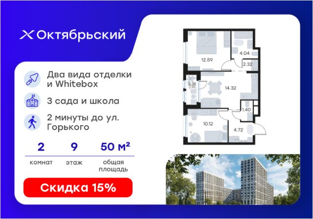 Продается 2-комн. квартира на 9-м этаже в строящемся проекте комфорт-класса Октябрьский. Общая площадь лота составляет 44,69 кв. м, из которых 20,88 кв. м отведено под жилую и 12,27 кв. м под кухонную зону. Номер квартиры - 682. Преимущества квартиры: Вид во двор; прямая остекленная лоджия - Собственная коммерческая инфраструктура и комьюнити-центр для жителей - Безопасность на всех уровнях: закрытый двор, видеонаблюдение и система "Умный Дом" - Безбарьерная среда - Дизайнерские остекленные холлы - Просторные колясочные в каждой секции - Эргономичные квартиры с европланировками - Чистовая отделка квартир в 2 стилях на выбор и с дополнительной опцией покраски стен в 4 трендовых цвета на выбор: агатовый серый, серебристо-серый, серый шелк и тонкий лен. - Пешеходный бульвар, площадь с амфитеатром, велодорожки, спортивные и детские площадки, многоуровневые паркинги и "зеленые" дворы. - Строительство трех современных детских садов на 750 детей и проектирование общеобразовательной школы на 1500 учеников Октябрьский — масштабный проект комфорт-класса во Владимире, который расположился в 2-х минутах от ул. Горького. На территории 40 Га появятся 9 очередей жилого строительства с благоустроенными терриориями и концепцией "Тихий двор". 7,31 Га выделено под озеленение. Октябрьский — это комфортная среда обитания, где каждый сантиметр продуман и логичен. Это единое пространство, в которое входят пешеходный бульвар, площадь с амфитеатром, велодорожки, спортивные и детские площадки, многоуровневые паркинги и "зеленые" дворы. Во дворах есть всё для тренировок на свежем воздухе: велодорожки, турники, брусья, площадки для кроссфита и воркаута с мембранным покрытием для круглогодичных занятий. В коммерческих помещениях первых этажей планируется размещение аптек, магазинов, кафе и сервисных центров, необходимых для комфортной жизни. Октябрьский находится в локации с развитой инфраструктурой и хорошей транспортной доступностью. В шаговой доступности расположены остановки общественного транспорта, 3 детских сада, 3 школы и главный корпус Владимирского государственного университета. Отличительное преимущество проекта Октябрьский — видовые квартиры на верхних этажах. Все помещения сдаются уже с предчистовой отделкой. Вы сможете сразу переехать и начать жить в новом доме. Цена указана при 100% оплате или стандартной ипотеке. Узнайте подробности в Отделе продаж. Продам 2-комнатную квартиру в новостройке в Владимирской области.