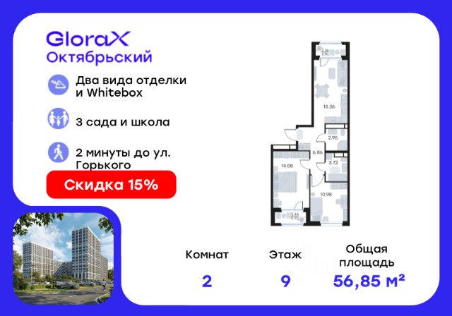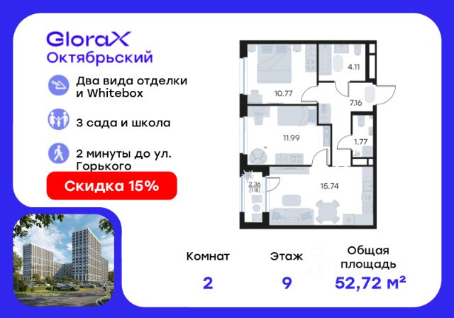 Продается 2-комн. квартира на 9-м этаже в строящемся проекте комфорт-класса GloraX Октябрьский. Общая площадь лота составляет 52,72 кв. м, из которых 22,76 кв. м отведено под жилую и 15,74 кв. м под кухонную зону. Номер квартиры - 544. Преимущества квартиры: Европланировка; вид во двор; прямая остекленная лоджия - Собственная коммерческая инфраструктура и комьюнити-центр для жителей - Безопасность на всех уровнях: закрытый двор, видеонаблюдение и система "Умный Дом" - Безбарьерная среда - Дизайнерские остекленные холлы - Просторные колясочные в каждой секции - Эргономичные квартиры с европланировками - Чистовая отделка квартир в 2 стилях на выбор и с дополнительной опцией покраски стен в 4 трендовых цвета на выбор: агатовый серый, серебристо-серый, серый шелк и тонкий лен. - Пешеходный бульвар, площадь с амфитеатром, велодорожки, спортивные и детские площадки, многоуровневые паркинги и "зеленые" дворы. - Строительство трех современных детских садов на 750 детей и проектирование общеобразовательной школы на 1500 учеников GloraX Октябрьский — масштабный проект комфорт-класса во Владимире, который расположился в 2-х минутах от ул. Горького. На территории 40 Га появятся 9 очередей жилого строительства с благоустроенными терриориями и концепцией "Тихий двор". 7,31 Га выделено под озеленение. GloraX Октябрьский — это комфортная среда обитания, где каждый сантиметр продуман и логичен. Это единое пространство, в которое входят пешеходный бульвар, площадь с амфитеатром, велодорожки, спортивные и детские площадки, многоуровневые паркинги и "зеленые" дворы. Во дворах есть всё для тренировок на свежем воздухе: велодорожки, турники, брусья, площадки для кроссфита и воркаута с мембранным покрытием для круглогодичных занятий. В коммерческих помещениях первых этажей планируется размещение аптек, магазинов, кафе и сервисных центров, необходимых для комфортной жизни. GloraX Октябрьский находится в локации с развитой инфраструктурой и хорошей транспортной доступностью. В шаговой доступности расположены остановки общественного транспорта, 3 детских сада, 3 школы и главный корпус Владимирского государственного университета. Отличительное преимущество GloraX Октябрьский — видовые квартиры на верхних этажах. Все помещения сдаются уже с предчистовой отделкой. Вы сможете сразу переехать и начать жить в новом доме. Цена указана при 100% оплате или стандартной ипотеке. Узнайте подробности в Отделе продаж. Продается 2-комнатная квартира от застройщика в районе Октябрьский в городе Владимир.