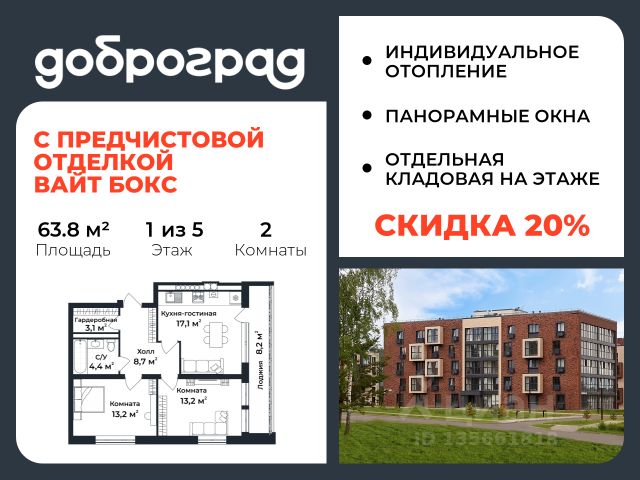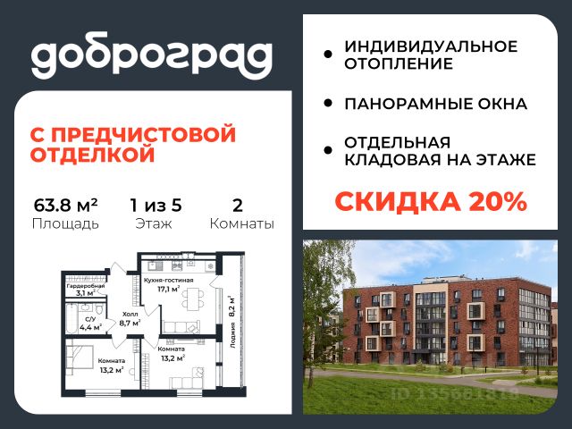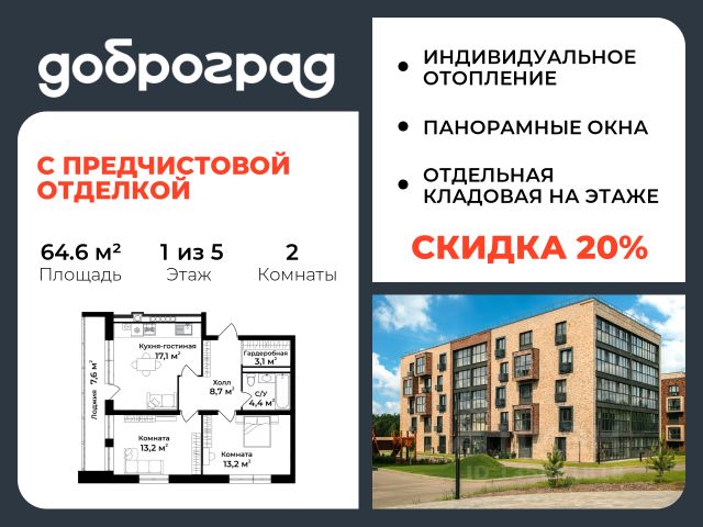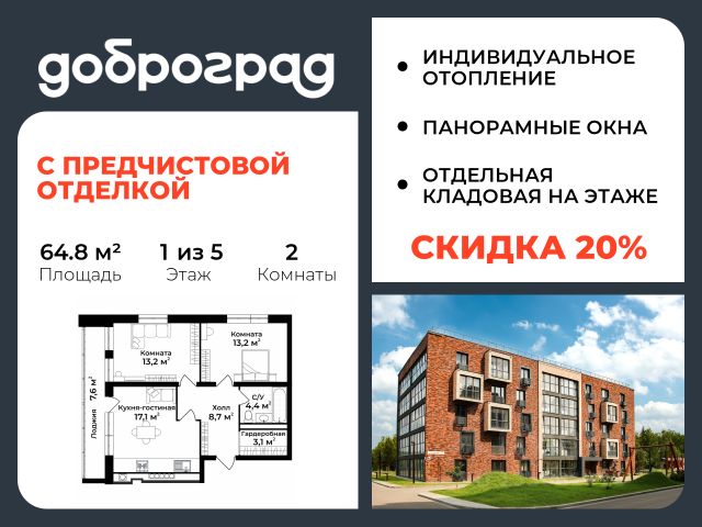 Продается 2-к квартира 64.60 кв.м. С ПРЕДЧИСТОВОЙ ОТДЕЛКОЙ в новом уже построенном доме по адресу: Владимирская область, Доброград, улица Удачная, д.7 корп.2 . Дом монолитно-блочный, в квартире предусмотрено индивидуальное отопление двухконтурным газовым котлом. ДОМ СДАН! Квартира находится на 1 этаже 5-этажного дома. На лестничной площадке предусмотрена собственная кладовая комната (келлер) для хранения вещей. В доме есть лифт, просторные входные группы, организован безбарьерный вход в подъезд. Функциональная планировка, большая кухня-гостиная, эффектная лоджия с панорамным остеклением, гардеробная помогут грамотно организовать пространство. Отделка квартиры включает в себя: - пол - полусухая стяжка, - стены подготовлены под поклейку обоев, - электроразводка, выводы для освещения, - разводка сантехнических и водопроводных труб, канализации, - ванная - гидроизоляция пола, штукатурка стен, - откосы из ГВЛ, подоконники из ПВХ, - лоджия - выводы для освещения, розетки и выключателя. Рядом расположен живописный природный парк, озеро, места для отдыха и прогулок, качественные игровые площадки. Доброград - это превосходная экология и современная инфраструктура всего в 2,5 часах от Москвы. В городе работает современный образовательный комплекс "МИР" (частная школа и детский сад), муниципальная гимназия. В 2026 году состоится открытие государственного детского сада и физкультурно-оздоровительного комплекса с бассейном. Медицинское обслуживание обеспечивает Первый клинический медицинский центр, расположенный в 12 километрах от Доброграда, а в самом Доброграде работает кабинет врача общей практики. Территория охраняется, въезд строго по пропускам, что гарантирует безопасность Вам и Вашей семье. В Доброграде организованы необходимые условия для занятий спортом круглый год: - оборудованные площадки для самых популярных видов спорта, - крытый спортивный комплекс, - первое в регионе 9-луночное гольф-поле, - скейт-парк, - веревочный парк, - освещенные лыжные и велосипедные трассы, - крупнейший в Европе вейк-парк. Город обслуживает собственная управляющая компания, которая обеспечивает бесперебойную работу всех систем, чистоту и порядок на территории. Стоимость в объявлении указана со скидкой, скидка предоставляется при условии единовременной полной оплаты или покупки в ипотеку. Квартиру можно приобрести за наличную оплату, в ипотеку, а также с рассрочкой от застройщика. Условия ипотеки и рассрочки уточняйте у менеджеров отдела продаж.