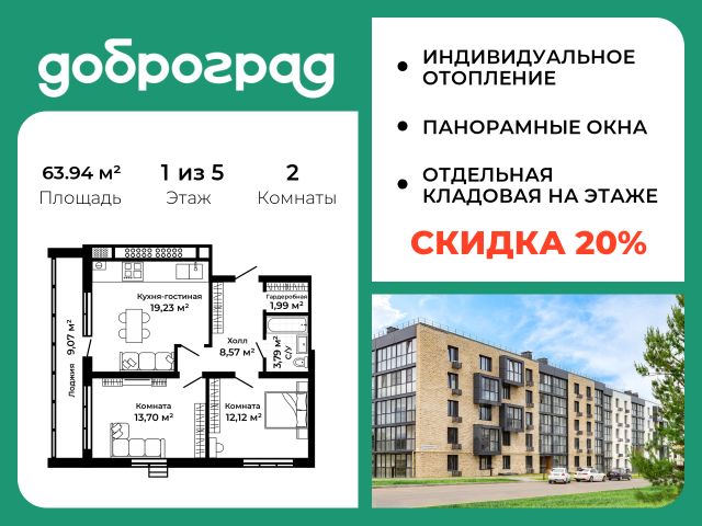 Продается 2-к квартира 64.70 кв.м. с полной ЧИСТОВОЙ ОТДЕЛКОЙ И КУХНЕЙ в новом уже построенном доме по адресу: Владимирская область, Доброград, улица Удачная, д.7 корп.3. Дом монолитно-блочный, в квартире предусмотрено индивидуальное отопление двухконтурным газовым котлом, что позволяет значительно экономить на комунальных платежах. ДОМ СДАН! Квартира находится на 5 этаже 5-этажного дома. На лестничной площадке предусмотрена собственная кладовая комната (келлер) для хранения вещей. В доме есть лифт, просторные входные группы, организован безбарьерный вход в подъезд. Функциональная планировка, большая кухня-гостиная, эффектная лоджия с панорамным остеклением, гардеробная помогут грамотно организовать пространство. Отделка квартиры включает в себя: - пол - керамогранит/ламинат; - стены - на кухне, в прихожей и в спальных комнатах - покраска, в санузле - керамогранит; - натяжные потолки со встроенными светильниками и выводами для подвесных светильников; - акриловая ванна, унитаз подвесной с инсталляцией, смесители, душевая система, подвесная раковина с тумбой, полотенцесушитель, вентилятор, вывод для стиральной машины; - выключатели и розетки; - кухонный гарнитур с врезной мойкой и смесителем, варочная панель, духовой шкаф встроенный, вытяжка встроенная, посудомоечная машина встроенная; - вывод под кондиционер; - межкомнатные двери; - отделка лоджии. Рядом расположен живописный природный парк, озеро, места для отдыха и прогулок, качественные игровые площадки. Доброград - это превосходная экология и современная инфраструктура всего в 2,5 часах от Москвы. В городе работает современный образовательный комплекс "МИР" (частная школа и детский сад), муниципальная гимназия. В 2025 году состоится открытие государственного детского сада и физкультурно-оздоровительного комплекса с бассейном. Медицинское обслуживание обеспечивает Первый клинический медицинский центр, расположенный в 12 километрах от Доброграда, а в самом Доброграде работает кабинет врача общей практики.Территория охраняется, въезд строго по пропускам, что гарантирует безопасность Вам и Вашей семье. В Доброграде организованы необходимые условия для занятий спортом круглый год: - оборудованные площадки для самых популярных видов спорта, - крытый спортивный комплекс, - первое в регионе 9-луночное гольф-поле, - скейт-парк, - веревочный парк, - освещенные лыжные и велосипедные трассы, - крупнейший в Европе вейк-парк. Город обслуживает собственная управляющая компания, которая обеспечивает бесперебойную работу всех систем, чистоту и порядок на территории. Стоимость в объявлении указана со скидкой, скидка предоставляется при условии единовременной полной оплаты или покупки в ипотеку. Квартиру можно приобрести за наличную оплату, в ипотеку, а также с рассрочкой от застройщика. Условия ипотеки и рассрочки уточняйте у менеджеров отдела продаж.