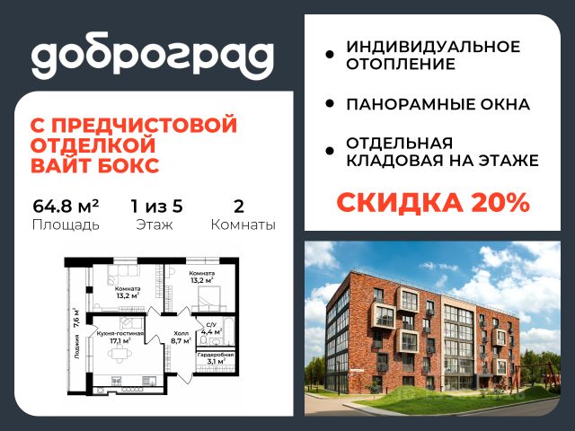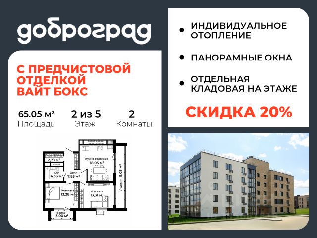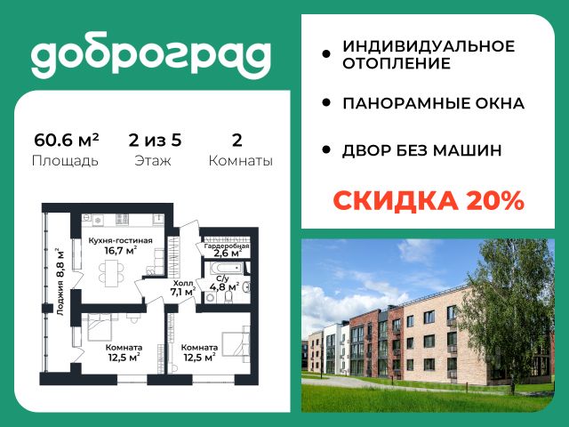 Продается 2-к квартира 64.60 кв.м. С ПРЕДЧИСТОВОЙ ОТДЕЛКОЙ в новом уже построенном доме по адресу: Владимирская область, Доброград, улица Удачная, д.7 корп.2 . Дом монолитно-блочный, в квартире предусмотрено индивидуальное отопление двухконтурным газовым котлом. ДОМ СДАН! Квартира находится на 1 этаже 5-этажного дома. На лестничной площадке предусмотрена собственная кладовая комната (келлер) для хранения вещей. В доме есть лифт, просторные входные группы, организован безбарьерный вход в подъезд. Функциональная планировка, большая кухня-гостиная, эффектная лоджия с панорамным остеклением, гардеробная помогут грамотно организовать пространство. Отделка квартиры включает в себя: - пол - полусухая стяжка, - стены подготовлены под поклейку обоев, - электроразводка, выводы для освещения, - разводка сантехнических и водопроводных труб, канализации, - ванная - гидроизоляция пола, штукатурка стен, - откосы из ГВЛ, подоконники из ПВХ, - лоджия - выводы для освещения, розетки и выключателя. Рядом расположен живописный природный парк, озеро, места для отдыха и прогулок, качественные игровые площадки. Доброград - это превосходная экология и современная инфраструктура всего в 2,5 часах от Москвы. В городе работает современный образовательный комплекс "МИР" (частная школа и детский сад), муниципальная гимназия. В 2026 году состоится открытие государственного детского сада и физкультурно-оздоровительного комплекса с бассейном. Медицинское обслуживание обеспечивает Первый клинический медицинский центр, расположенный в 12 километрах от Доброграда, а в самом Доброграде работает кабинет врача общей практики. Территория охраняется, въезд строго по пропускам, что гарантирует безопасность Вам и Вашей семье. В Доброграде организованы необходимые условия для занятий спортом круглый год: - оборудованные площадки для самых популярных видов спорта, - крытый спортивный комплекс, - первое в регионе 9-луночное гольф-поле, - скейт-парк, - веревочный парк, - освещенные лыжные и велосипедные трассы, - крупнейший в Европе вейк-парк. Город обслуживает собственная управляющая компания, которая обеспечивает бесперебойную работу всех систем, чистоту и порядок на территории. Стоимость в объявлении указана со скидкой, скидка предоставляется при условии единовременной полной оплаты или покупки в ипотеку. Квартиру можно приобрести за наличную оплату, в ипотеку, а также с рассрочкой от застройщика. Условия ипотеки и рассрочки уточняйте у менеджеров отдела продаж.