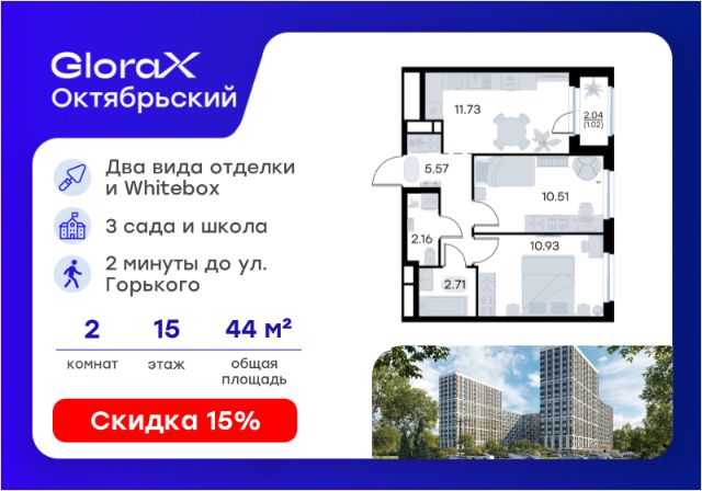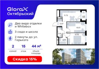 Продается 2-комн. квартира на 7-м этаже в строящемся проекте комфорт-класса GloraX Октябрьский. Общая площадь лота составляет 45,82 кв. м, из которых 22,07 кв. м отведено под жилую и 12,53 кв. м под кухонную зону. Номер квартиры - 261. Преимущества квартиры: Вид во двор; прямая остекленная лоджия - Собственная коммерческая инфраструктура и комьюнити-центр для жителей - Безопасность на всех уровнях: закрытый двор, видеонаблюдение и система "Умный Дом" - Безбарьерная среда - Дизайнерские остекленные холлы - Просторные колясочные в каждой секции - Эргономичные квартиры с европланировками - Чистовая отделка квартир в 2 стилях на выбор и с дополнительной опцией покраски стен в 4 трендовых цвета на выбор: агатовый серый, серебристо-серый, серый шелк и тонкий лен. - Пешеходный бульвар, площадь с амфитеатром, велодорожки, спортивные и детские площадки, многоуровневые паркинги и "зеленые" дворы. - Строительство трех современных детских садов на 750 детей и проектирование общеобразовательной школы на 1500 учеников GloraX Октябрьский — масштабный проект комфорт-класса во Владимире, который расположился в 2-х минутах от ул. Горького. На территории 40 Га появятся 9 очередей жилого строительства с благоустроенными терриориями и концепцией "Тихий двор". 7,31 Га выделено под озеленение. GloraX Октябрьский — это комфортная среда обитания, где каждый сантиметр продуман и логичен. Это единое пространство, в которое входят пешеходный бульвар, площадь с амфитеатром, велодорожки, спортивные и детские площадки, многоуровневые паркинги и "зеленые" дворы. Во дворах есть всё для тренировок на свежем воздухе: велодорожки, турники, брусья, площадки для кроссфита и воркаута с мембранным покрытием для круглогодичных занятий. В коммерческих помещениях первых этажей планируется размещение аптек, магазинов, кафе и сервисных центров, необходимых для комфортной жизни. GloraX Октябрьский находится в локации с развитой инфраструктурой и хорошей транспортной доступностью. В шаговой доступности расположены остановки общественного транспорта, 3 детских сада, 3 школы и главный корпус Владимирского государственного университета. Отличительное преимущество GloraX Октябрьский — видовые квартиры на верхних этажах. Все помещения сдаются уже с предчистовой отделкой. Вы сможете сразу переехать и начать жить в новом доме. Цена указана при 100% оплате или стандартной ипотеке. Узнайте подробности в Отделе продаж.