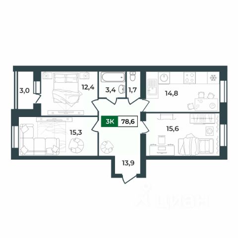 Особенностью этой трёхкомнатной квартиры является объединенная с кухней гостиная общей площадью почти 19 квадратных метров! Помещение разделено на зоны для приготовления пищи, где можно установить кухонный гарнитур и большой обеденный стол для всей семьи, и ТВ-зону, где поместится хороший просторный диван. Из кухни имеется выход на просторную лоджию площадью почти 5 квадратных метров. При сдаче дома лоджия будет остеклена! При такой планировке совмещенной кухни и гостиной, неоспоримым преимуществом этой трёхкомнатной квартиры являются три отдельные комнаты площадью 12,3, 12,8 и 13,5 квадратных метра соответственно. Большая комната заслуживает отдельного внимания, поскольку в ней проектом предусмотрен собственный санузел. Такие комнаты называются мастер-спальнями. Также в квартире есть второй полноценный санузел площадью 4 квадратных метра, где можно установить душевую кабину или ванну, унитаз и раковину. В изолированной прихожей площадью 7 квадратных метров предусмотрено место для установки вместительного шкафа для хранения верхней одежды и обуви и дополнительных полок для хранения. Прихожая изолирована, благодаря чему грязь и песок с улицы не попадут в жилое помещение. Дополнительные места для хранения при желании также можно разместить и в просторной прихожей площадью более 5 квадратных метров. Доступны такие способы покупки, как наличные, ипотека от ведущих банков (в т.ч. все программы с субсидиями и господдержка), ипотека со снижением ставки за счёт застройщика, рассрочка до 2 лет напрямую от застройщика. В цену квартиры сразу входит предчистовая отделка от застройщика с гарантией на все работы!