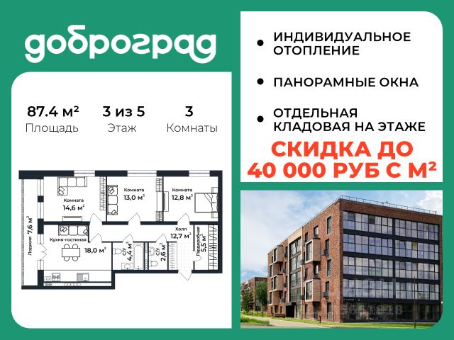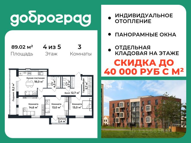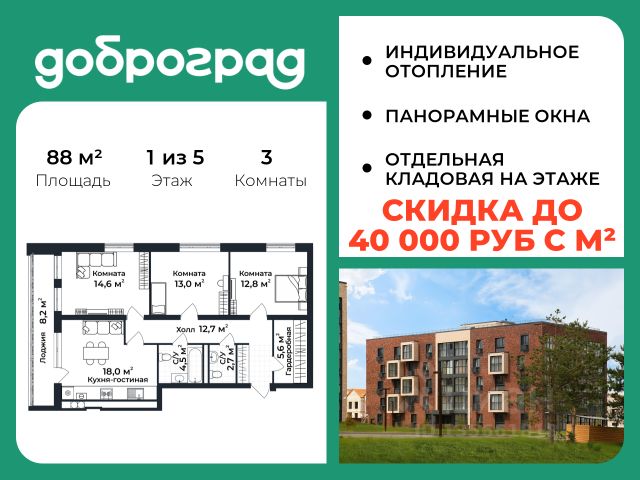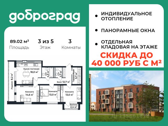 Продается 3-к квартира 88.00 кв.м. в новом построенном доме по адресу: Владимирская область, Доброград, улица Долголетия, д.3, корп. 1. Дом монолитно-блочный, в квартире предусмотрено ИНДИВИДУАЛЬНОЕ ОТОПЛЕНИЕ двухконтурным газовым котлом, что позволяет значительно экономить на коммунальных платежах. Квартира находится на 5 этаже 5-этажного дома. На лестничной площадке предусмотрена собственная КЛАДОВАЯ (келлер) для хранения вещей. В доме есть ЛИФТ, сквозной подъезд с просторной входной группой, большая колясочная. Функциональная планировка, большая кухня-гостиная, эффектная лоджия с ПАНОРАМНЫМ ОСТЕКЛЕНИЕМ, гардеробная помогут грамотно организовать пространство. ДОМ СДАН! Рядом расположен живописный природный парк, озеро, места для отдыха и прогулок, качественные игровые площадки. Доброград - это превосходная экология и современная инфраструктура всего в 2,5 часах от Москвы. В городе работает современный образовательный комплекс "МИР" (частная школа и детский сад), муниципальная гимназия. В 2026 году состоится открытие государственного детского сада и физкультурно-оздоровительного комплекса с бассейном. Медицинское обслуживание обеспечивает Первый клинический медицинский центр, расположенный в 12 километрах от Доброграда, а в самом Доброграде работает кабинет врача общей практики. Территория охраняется, въезд строго по пропускам, что гарантирует безопасность Вам и Вашей семье. В Доброграде организованы необходимые условия для занятий спортом круглый год: - оборудованные площадки для самых популярных видов спорта, - крытый спортивный комплекс, - первое в регионе 9-луночное гольф-поле, - скейт-парк, - веревочный парк, - освещенные лыжные и велосипедные трассы, - крупнейший в Европе вейк-парк. Город обслуживает собственная управляющая компания, которая обеспечивает бесперебойную работу всех систем, чистоту и порядок на территории. Стоимость в объявлении указана со скидкой, скидка предоставляется при условии единовременной полной оплаты или покупки в ипотеку. Квартиру можно приобрести за наличную оплату, в ипотеку, а также с рассрочкой от застройщика. Условия ипотеки и рассрочки уточняйте у менеджеров отдела продаж.