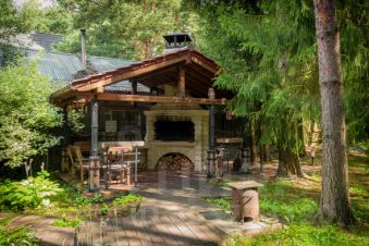Зона отдыха: стационарные мангал (почти новый) и большой стол. Металлический забор, откатные электрические ворота с пультом, видеодомофон.