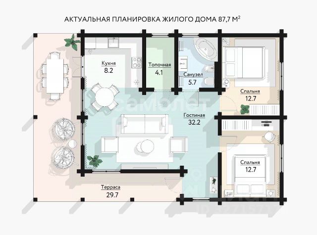 В кухне-гостиной легко размещается и большой кухонный гарнитур, и столовая группа, и большой диван. В спальнях предостаточно места для размещения спальных мест, шкафов и прочей мебели.
