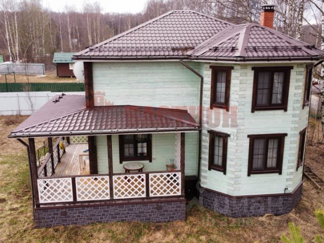Внешняя отделка стилизованная: планкен и дикий камень. Внутренняя отделка - имитация бруса из леса северных пород, зимнее утепление. Фундамент ленточный. Кровля- металлочерепица повышенной прочности, ламинированные в тон окна ПВХ триплекс.