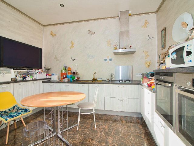 На кухне установлен гарнитур фабрики "Мария", в гостиной окна сделаны "в пол".