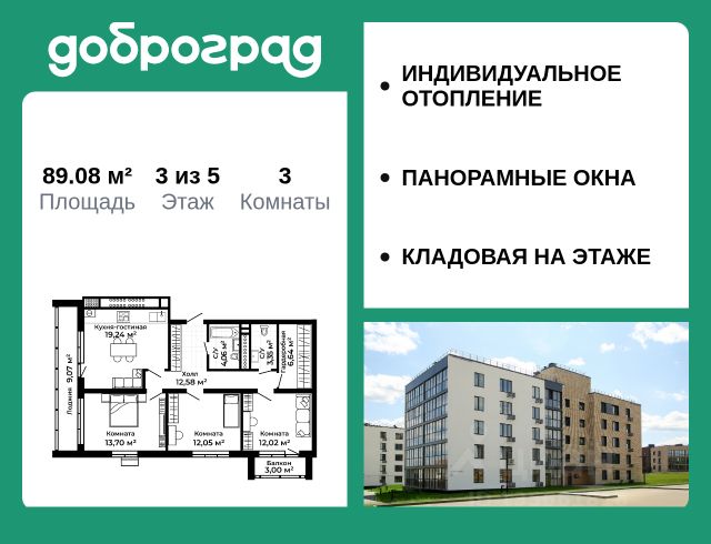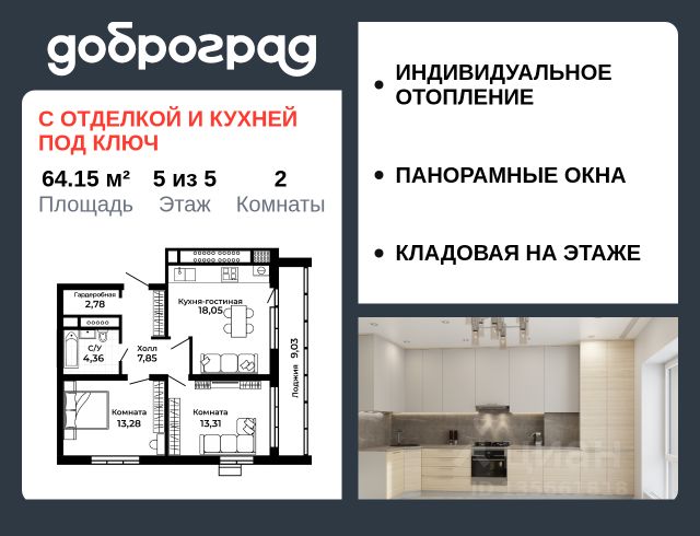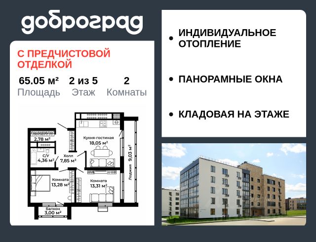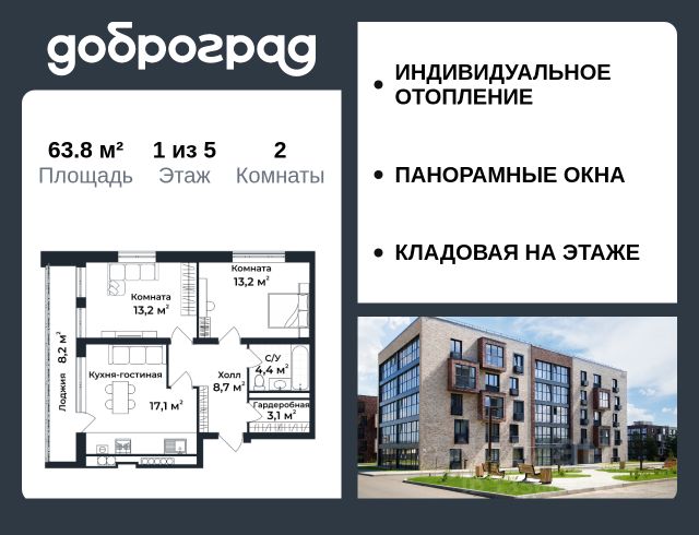 Продается 2-к квартира 60,6 кв.м. в новом построенном доме по адресу: Владимирская область, Доброград, улица Благополучия, д.1, корп. 2. В квартире предусмотрено ИНДИВИДУАЛЬНОЕ ОТОПЛЕНИЕ двухконтурным газовым котлом, что позволяет значительно экономить на коммунальных платежах. Функциональная планировка, просторная кухня-гостиная, эффектная лоджия с ПАНОРАМНЫМ ОСТЕКЛЕНИЕМ, гардеробная помогут грамотно организовать пространство. ДОМ СДАН! Квартира находится на 2 этаже 3-этажного дома. Рядом расположен живописный природный парк, озеро, места для отдыха и прогулок, качественные игровые площадки. Доброград - это превосходная экология и современная инфраструктура всего в 2,5 часах от Москвы. В городе работает современный образовательный комплекс "МИР" (частная школа и детский сад), муниципальная гимназия. В 2026 году состоится открытие государственного детского сада и физкультурно-оздоровительного комплекса с бассейном. Медицинское обслуживание обеспечивает Первый клинический медицинский центр, расположенный в 12 километрах от Доброграда, а в самом Доброграде работает кабинет врача общей практики. Территория охраняется, въезд строго по пропускам, что гарантирует безопасность Вам и Вашей семье. В Доброграде организованы необходимые условия для занятий спортом круглый год: - оборудованные площадки для самых популярных видов спорта, - крытый спортивный комплекс, - первое в регионе 9-луночное гольф-поле, - скейт-парк, - веревочный парк, - освещенные лыжные и велосипедные трассы, - крупнейший в Европе вейк-парк. Город обслуживает собственная управляющая компания, которая обеспечивает бесперебойную работу всех систем, чистоту и порядок на территории. Квартиру можно приобрести за наличную оплату, в ипотеку, а также с рассрочкой от застройщика. Условия ипотеки и рассрочки уточняйте у менеджеров отдела продаж.