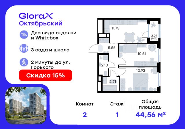 Продается 2-комн. квартира на 1-м этаже в строящемся проекте комфорт-класса GloraX Октябрьский. Общая площадь лота составляет 44,56 кв. м, из которых 21,44 кв. м отведено под жилую и 11,73 кв. м под кухонную зону. Номер квартиры - 1. Преимущества квартиры: Высокие потолки; вид во двор; отделена грязная зона; прямая остекленная лоджия - Собственная коммерческая инфраструктура и комьюнити-центр для жителей - Безопасность на всех уровнях: закрытый двор, видеонаблюдение и система "Умный Дом" - Безбарьерная среда - Дизайнерские остекленные холлы - Просторные колясочные в каждой секции - Эргономичные квартиры с европланировками - Чистовая отделка квартир в 2 стилях на выбор и с дополнительной опцией покраски стен в 4 трендовых цвета на выбор: агатовый серый, серебристо-серый, серый шелк и тонкий лен. - Пешеходный бульвар, площадь с амфитеатром, велодорожки, спортивные и детские площадки, многоуровневые паркинги и "зеленые" дворы. - Строительство трех современных детских садов на 750 детей и проектирование общеобразовательной школы на 1500 учеников GloraX Октябрьский — масштабный проект комфорт-класса во Владимире, который расположился в 2-х минутах от ул. Горького. На территории 40 Га появятся 9 очередей жилого строительства с благоустроенными терриориями и концепцией "Тихий двор". 7,31 Га выделено под озеленение. GloraX Октябрьский — это комфортная среда обитания, где каждый сантиметр продуман и логичен. Это единое пространство, в которое входят пешеходный бульвар, площадь с амфитеатром, велодорожки, спортивные и детские площадки, многоуровневые паркинги и "зеленые" дворы. Во дворах есть всё для тренировок на свежем воздухе: велодорожки, турники, брусья, площадки для кроссфита и воркаута с мембранным покрытием для круглогодичных занятий. В коммерческих помещениях первых этажей планируется размещение аптек, магазинов, кафе и сервисных центров, необходимых для комфортной жизни. GloraX Октябрьский находится в локации с развитой инфраструктурой и хорошей транспортной доступностью. В шаговой доступности расположены остановки общественного транспорта, 3 детских сада, 3 школы и главный корпус Владимирского государственного университета. Отличительное преимущество GloraX Октябрьский — видовые квартиры на верхних этажах. Все помещения сдаются уже с предчистовой отделкой. Вы сможете сразу переехать и начать жить в новом доме. Цена указана при 100% оплате или стандартной ипотеке. Узнайте подробности в Отделе продаж.