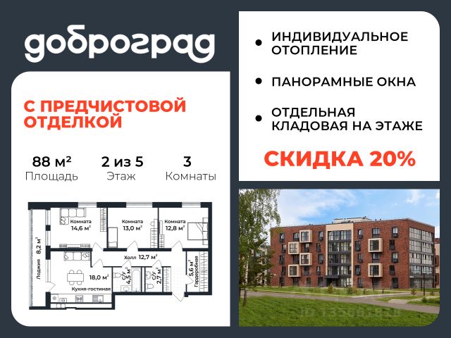 Продается 3-к квартира 87.40 кв.м. в новом построенном доме по адресу: Владимирская область, Доброград, улица Долголетия, д.3, корп. 1. Дом монолитно-блочный, в квартире предусмотрено ИНДИВИДУАЛЬНОЕ ОТОПЛЕНИЕ двухконтурным газовым котлом, что позволяет значительно экономить на коммунальных платежах. Квартира находится на 2 этаже 5-этажного дома. На лестничной площадке предусмотрена собственная КЛАДОВАЯ (келлер) для хранения вещей. В доме есть ЛИФТ, сквозной подъезд с просторной входной группой, большая колясочная. Функциональная планировка, большая кухня-гостиная, эффектная лоджия с ПАНОРАМНЫМ ОСТЕКЛЕНИЕМ, гардеробная помогут грамотно организовать пространство. ДОМ СДАН! Рядом расположен живописный природный парк, озеро, места для отдыха и прогулок, качественные игровые площадки. Доброград - это превосходная экология и современная инфраструктура всего в 2,5 часах от Москвы. В городе работает современный образовательный комплекс "МИР" (частная школа и детский сад), муниципальная гимназия. В 2026 году состоится открытие государственного детского сада и физкультурно-оздоровительного комплекса с бассейном. Медицинское обслуживание обеспечивает Первый клинический медицинский центр, расположенный в 12 километрах от Доброграда, а в самом Доброграде работает кабинет врача общей практики. Территория охраняется, въезд строго по пропускам, что гарантирует безопасность Вам и Вашей семье. В Доброграде организованы необходимые условия для занятий спортом круглый год: - оборудованные площадки для самых популярных видов спорта, - крытый спортивный комплекс, - первое в регионе 9-луночное гольф-поле, - скейт-парк, - веревочный парк, - освещенные лыжные и велосипедные трассы, - крупнейший в Европе вейк-парк. Город обслуживает собственная управляющая компания, которая обеспечивает бесперебойную работу всех систем, чистоту и порядок на территории. Стоимость в объявлении указана со скидкой, скидка предоставляется при условии единовременной полной оплаты или покупки в ипотеку. Квартиру можно приобрести за наличную оплату, в ипотеку, а также с рассрочкой от застройщика. Условия ипотеки и рассрочки уточняйте у менеджеров отдела продаж.