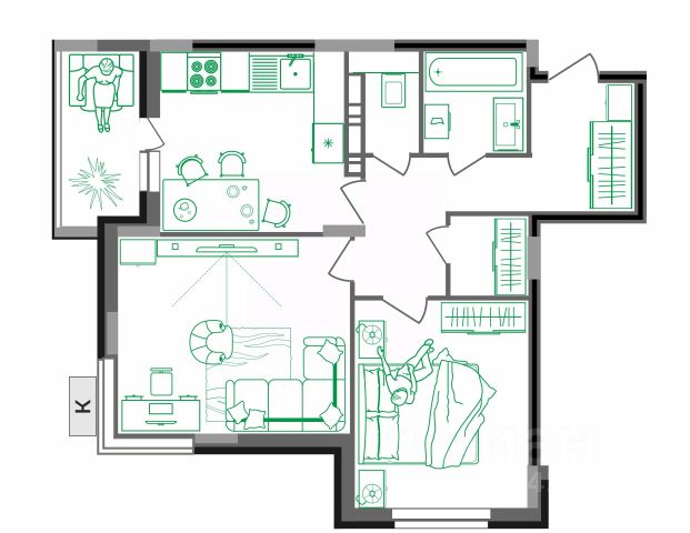 Особенностью этой двухкомнатной квартиры является объединенная с кухней гостиная общей площадью почти 20 квадратных метров! Помещение разделено на зоны для приготовления пищи, где можно установить кухонный гарнитур и большой обеденный стол для всей семьи, и ТВ-зону, где поместится хороший просторный диван. Из кухни имеется выход на лоджию (больше 3 кв. м.), которая будет остеклена 2-камерным стеклопакетом при сдаче дома. При такой планировке совмещенной кухни и гостиной, неоспоримым преимуществом этой двухкомнатной квартиры являются две отдельные комнаты. Одну из них, можно использовать под спальную комнату, где можно установить широкую кровать или раскладной диван и вместительный шкаф для одежды. А вторую комнату можно использовать в качестве детской или кабинета. Интересным и полезным решением в этой двухкомнатной квартире стали два санузла! Один - полноценный, площадью больше 5,5 квадратных метра, где можно установить раковину, ванну или душевую кабину, а второй - небольшой, площадью 2,2квадратных метра, с отдельным унитазом. Для семьи с детьми - очень актуальное решение.Отдельное внимание стоит обратить на помещение рядом с большим санузлом в нём можно организовать отдельную постирочную комнату или гардеробную. В изолированной прихожей площадью 9 квадратных метров предусмотрено место для установки шкафа для хранения верхней одежды и обуви. Доступны такие способы покупки, как наличные, ипотека от ведущих банков (в т.ч. все программы с субсидиями и господдержка), ипотека со снижением ставки за счёт застройщика, рассрочка до 2 лет напрямую от застройщика. В цену квартиры сразу входит ремонт в формате White Box с гарантией на все работы!