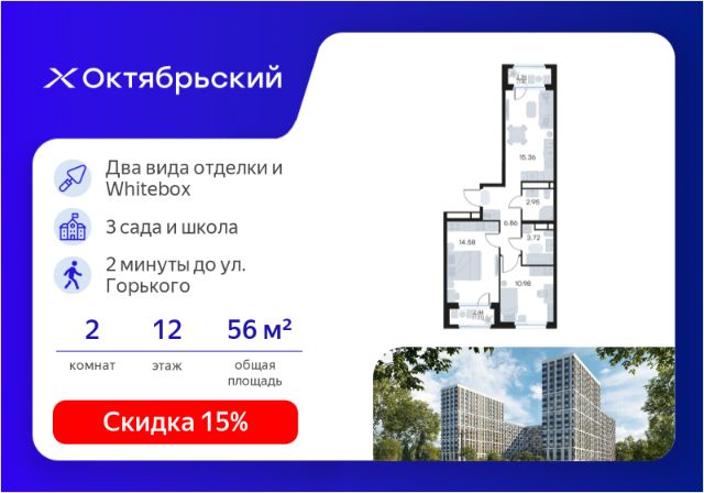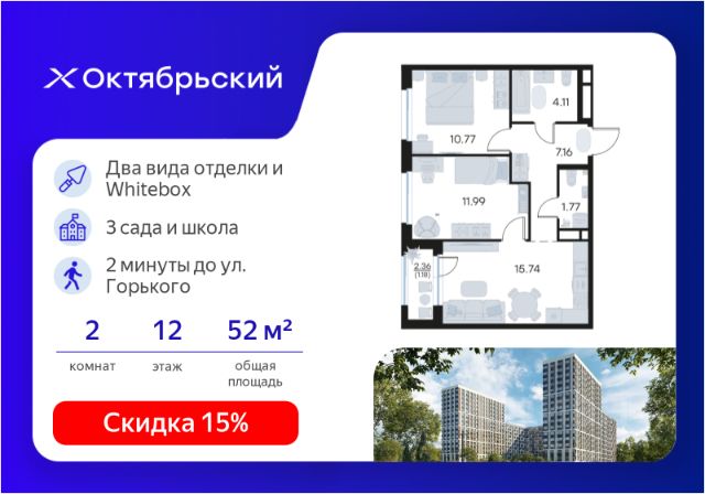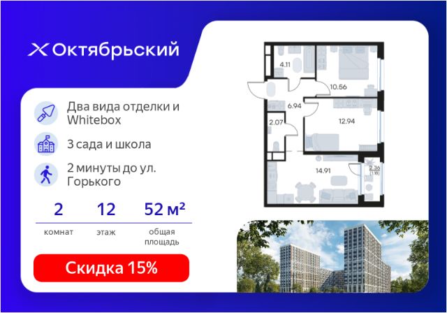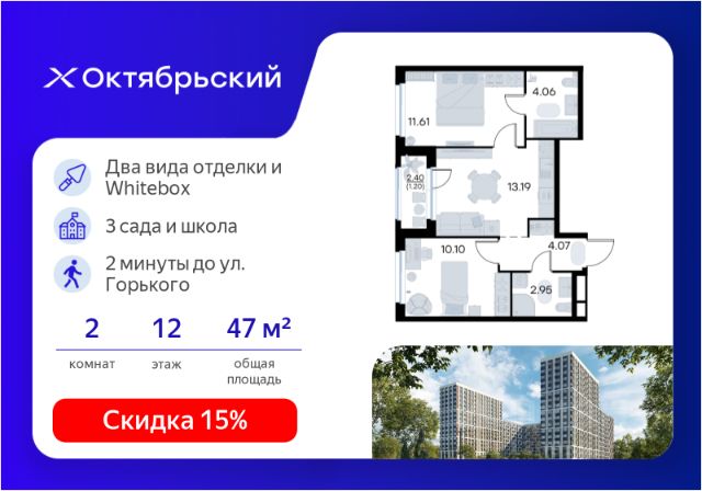 Отличительное преимущество проекта Октябрьский — видовые квартиры на верхних этажах. Все помещения сдаются уже с предчистовой отделкой. Вы сможете сразу переехать и начать жить в новом доме.
