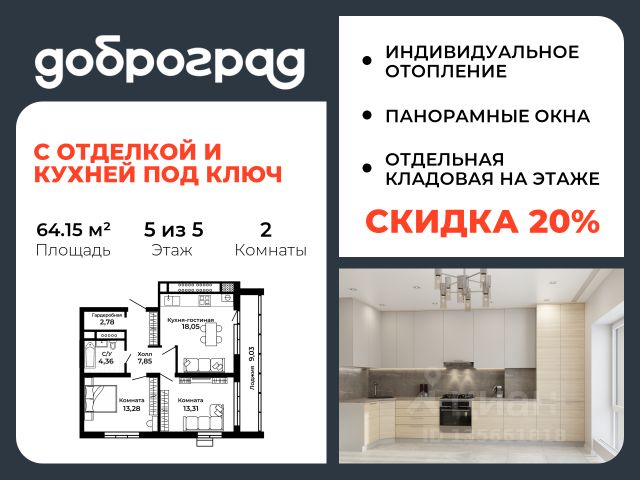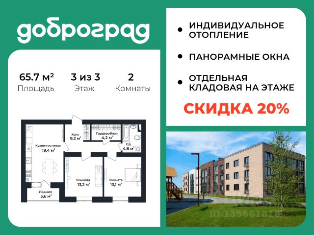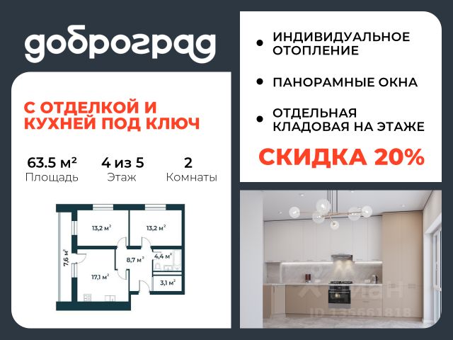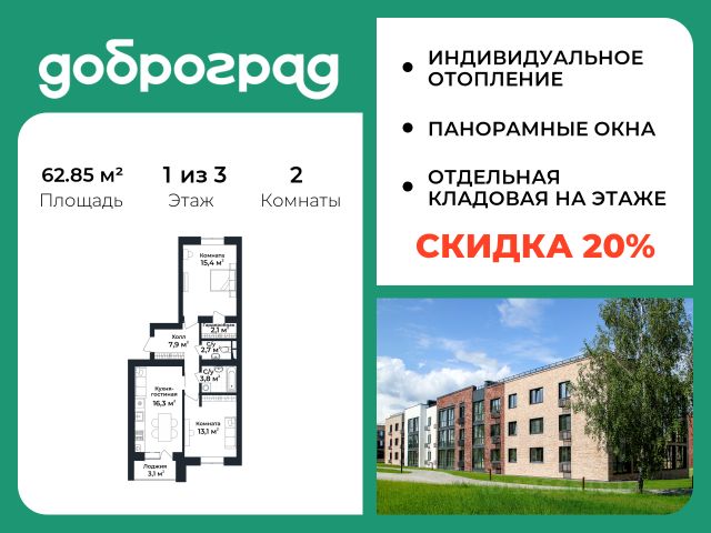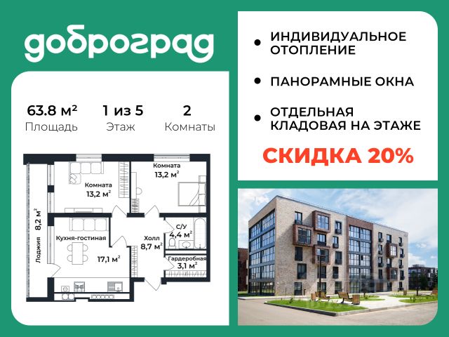Продается 1-к квартира 42,45 кв.м. в новом построенном доме по адресу: Владимирская область, Доброград, улица Благополучия, д.1, корп. 1. В квартире предусмотрено ИНДИВИДУАЛЬНОЕ ОТОПЛЕНИЕ двухконтурным газовым котлом, что позволяет значительно экономить на коммунальных платежах. Функциональная планировка, просторная кухня-гостиная, эффектная лоджия с ПАНОРАМНЫМ ОСТЕКЛЕНИЕМ, гардеробная помогут грамотно организовать пространство. ДОМ СДАН! Квартира находится на 3 этаже 3-этажного дома. Рядом расположен живописный природный парк, озеро, места для отдыха и прогулок, качественные игровые площадки. Доброград - это превосходная экология и современная инфраструктура всего в 2,5 часах от Москвы. В городе работает современный образовательный комплекс "МИР" (частная школа и детский сад), муниципальная гимназия. В 2025 году состоится открытие государственного детского сада и физкультурно-оздоровительного комплекса с бассейном. Медицинское обслуживание обеспечивает Первый клинический медицинский центр, расположенный в 12 километрах от Доброграда, а в самом Доброграде работает кабинет врача общей практики. Территория охраняется, въезд строго по пропускам, что гарантирует безопасность Вам и Вашей семье. В Доброграде организованы необходимые условия для занятий спортом круглый год: - оборудованные площадки для самых популярных видов спорта, - крытый спортивный комплекс, - первое в регионе 9-луночное гольф-поле, - скейт-парк, - веревочный парк, - освещенные лыжные и велосипедные трассы, - крупнейший в Европе вейк-парк. Город обслуживает собственная управляющая компания, которая обеспечивает бесперебойную работу всех систем, чистоту и порядок на территории. Стоимость в объявлении указана со скидкой, скидка предоставляется при условии единовременной полной оплаты или покупки в ипотеку. Квартиру можно приобрести за наличную оплату, в ипотеку, а также с рассрочкой от застройщика. Условия ипотеки и рассрочки уточняйте у менеджеров отдела продаж.