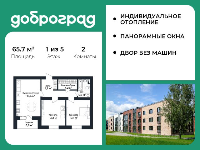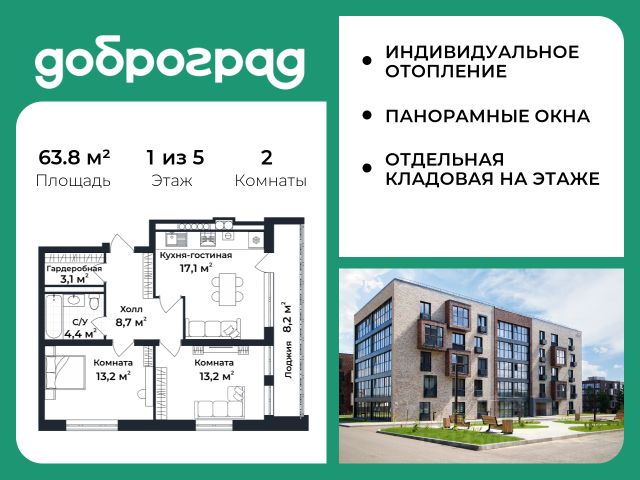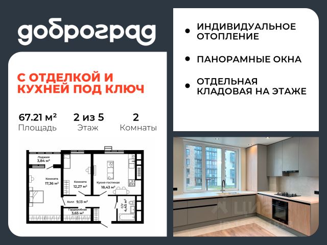 Продается 2-к квартира 64.80 кв.м. С ПРЕДЧИСТОВОЙ ОТДЕЛКОЙ в новом уже построенном доме по адресу: Владимирская область, Доброград, улица Удачная, д.7 корп.3. Дом монолитно-блочный, в квартире предусмотрено индивидуальное отопление двухконтурным газовым котлом. ДОМ СДАН! Квартира находится на 1 этаже 5-этажного дома. На лестничной площадке предусмотрена собственная кладовая комната (келлер) для хранения вещей. В доме есть лифт, просторные входные группы, организован безбарьерный вход в подъезд. Функциональная планировка, большая кухня-гостиная, эффектная лоджия с панорамным остеклением, гардеробная помогут грамотно организовать пространство. Отделка квартиры включает в себя: - пол - полусухая стяжка, - стены подготовлены под поклейку обоев, - электроразводка, выводы для освещения, - разводка сантехнических и водопроводных труб, канализации, - ванная - гидроизоляция пола, штукатурка стен, - откосы из ГВЛ, подоконники из ПВХ, - лоджия - выводы для освещения, розетки и выключателя. Рядом расположен живописный природный парк, озеро, места для отдыха и прогулок, качественные игровые площадки. Доброград - это превосходная экология и современная инфраструктура всего в 2,5 часах от Москвы. В городе работает современный образовательный комплекс "МИР" (частная школа и детский сад), муниципальная гимназия. В 2026 году состоится открытие государственного детского сада и физкультурно-оздоровительного комплекса с бассейном. Медицинское обслуживание обеспечивает Первый клинический медицинский центр, расположенный в 12 километрах от Доброграда, а в самом Доброграде работает кабинет врача общей практики. Территория охраняется, въезд строго по пропускам, что гарантирует безопасность Вам и Вашей семье. В Доброграде организованы необходимые условия для занятий спортом круглый год: - оборудованные площадки для самых популярных видов спорта, - крытый спортивный комплекс, - первое в регионе 9-луночное гольф-поле, - скейт-парк, - веревочный парк, - освещенные лыжные и велосипедные трассы, - крупнейший в Европе вейк-парк. Город обслуживает собственная управляющая компания, которая обеспечивает бесперебойную работу всех систем, чистоту и порядок на территории. Стоимость в объявлении указана со скидкой, скидка предоставляется при условии единовременной полной оплаты или покупки в ипотеку. Квартиру можно приобрести за наличную оплату, в ипотеку, а также с рассрочкой от застройщика. Условия ипотеки и рассрочки уточняйте у менеджеров отдела продаж.