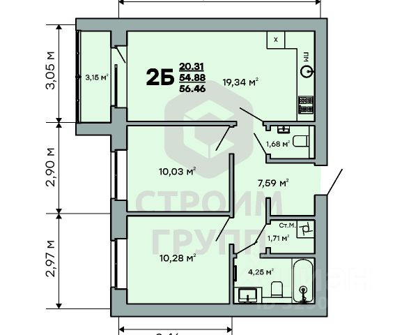Площадь квартиры 42,6 кв.м. Кухня увеличена. Имеется балкон. Есть гардеробная. Квартира не угловая.