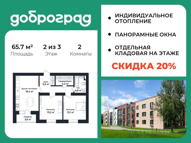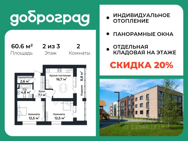 Продается 1-к квартира 42,45 кв.м. в новом построенном доме по адресу: Владимирская область, Доброград, улица Благополучия, д.1, корп. 1. В квартире предусмотрено ИНДИВИДУАЛЬНОЕ ОТОПЛЕНИЕ двухконтурным газовым котлом, что позволяет значительно экономить на коммунальных платежах. Функциональная планировка, просторная кухня-гостиная, эффектная лоджия с ПАНОРАМНЫМ ОСТЕКЛЕНИЕМ, гардеробная помогут грамотно организовать пространство. ДОМ СДАН! Квартира находится на 3 этаже 3-этажного дома. Рядом расположен живописный природный парк, озеро, места для отдыха и прогулок, качественные игровые площадки. Доброград - это превосходная экология и современная инфраструктура всего в 2,5 часах от Москвы. В городе работает современный образовательный комплекс "МИР" (частная школа и детский сад), муниципальная гимназия. В 2025 году состоится открытие государственного детского сада и физкультурно-оздоровительного комплекса с бассейном. Медицинское обслуживание обеспечивает Первый клинический медицинский центр, расположенный в 12 километрах от Доброграда, а в самом Доброграде работает кабинет врача общей практики. Территория охраняется, въезд строго по пропускам, что гарантирует безопасность Вам и Вашей семье. В Доброграде организованы необходимые условия для занятий спортом круглый год: - оборудованные площадки для самых популярных видов спорта, - крытый спортивный комплекс, - первое в регионе 9-луночное гольф-поле, - скейт-парк, - веревочный парк, - освещенные лыжные и велосипедные трассы, - крупнейший в Европе вейк-парк. Город обслуживает собственная управляющая компания, которая обеспечивает бесперебойную работу всех систем, чистоту и порядок на территории. Стоимость в объявлении указана со скидкой, скидка предоставляется при условии единовременной полной оплаты или покупки в ипотеку. Квартиру можно приобрести за наличную оплату, в ипотеку, а также с рассрочкой от застройщика. Условия ипотеки и рассрочки уточняйте у менеджеров отдела продаж.