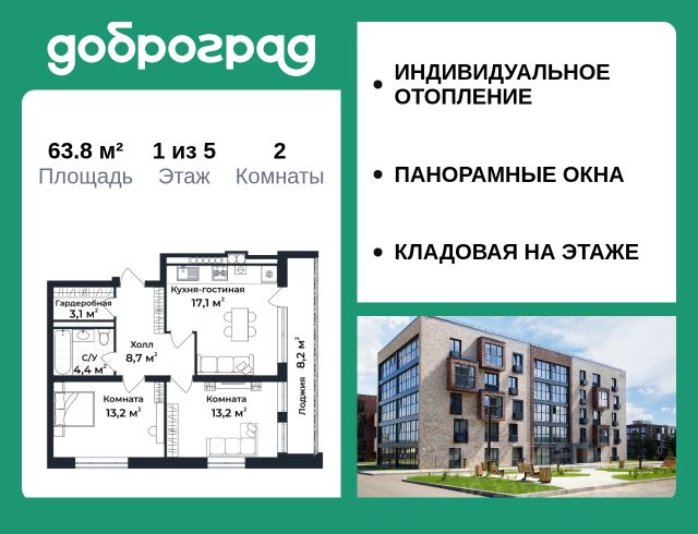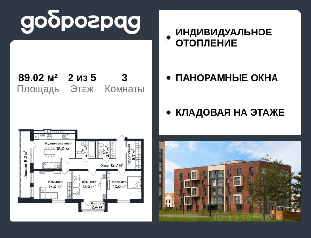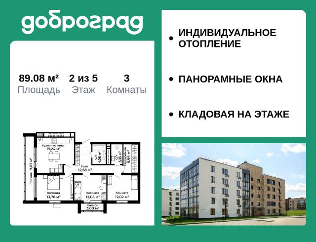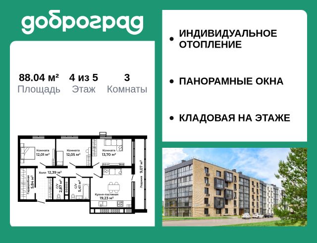 Продается 3-к квартира 88.00 кв.м. в новом построенном доме по адресу: Владимирская область, Доброград, улица Долголетия, д.3, корп. 1. Дом монолитно-блочный, в квартире предусмотрено ИНДИВИДУАЛЬНОЕ ОТОПЛЕНИЕ двухконтурным газовым котлом, что позволяет значительно экономить на коммунальных платежах. Квартира находится на 5 этаже 5-этажного дома. На лестничной площадке предусмотрена собственная КЛАДОВАЯ (келлер) для хранения вещей. В доме есть ЛИФТ, сквозной подъезд с просторной входной группой, большая колясочная. Функциональная планировка, большая кухня-гостиная, эффектная лоджия с ПАНОРАМНЫМ ОСТЕКЛЕНИЕМ, гардеробная помогут грамотно организовать пространство. ДОМ СДАН! Рядом расположен живописный природный парк, озеро, места для отдыха и прогулок, качественные игровые площадки. Доброград - это превосходная экология и современная инфраструктура всего в 2,5 часах от Москвы. В городе работает современный образовательный комплекс "МИР" (частная школа и детский сад), муниципальная гимназия. В 2026 году состоится открытие государственного детского сада и физкультурно-оздоровительного комплекса с бассейном. Медицинское обслуживание обеспечивает Первый клинический медицинский центр, расположенный в 12 километрах от Доброграда, а в самом Доброграде работает кабинет врача общей практики. Территория охраняется, въезд строго по пропускам, что гарантирует безопасность Вам и Вашей семье. В Доброграде организованы необходимые условия для занятий спортом круглый год: - оборудованные площадки для самых популярных видов спорта, - крытый спортивный комплекс, - первое в регионе 9-луночное гольф-поле, - скейт-парк, - веревочный парк, - освещенные лыжные и велосипедные трассы, - крупнейший в Европе вейк-парк. Город обслуживает собственная управляющая компания, которая обеспечивает бесперебойную работу всех систем, чистоту и порядок на территории. Квартиру можно приобрести за наличную оплату, в ипотеку, а также с рассрочкой от застройщика. Условия ипотеки и рассрочки уточняйте у менеджеров отдела продаж.