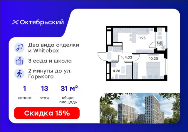 Продается 1-комн. квартира на 11-м этаже в строящемся проекте комфорт-класса Октябрьский. Общая площадь лота составляет 30,29 кв. м, из которых 10,19 кв. м отведено под жилую и 10,87 кв. м под кухонную зону. Номер квартиры - 320. Преимущества квартиры: Вид на улицу; прямая остекленная лоджия - Собственная коммерческая инфраструктура и комьюнити-центр для жителей - Безопасность на всех уровнях: закрытый двор, видеонаблюдение и система "Умный Дом" - Безбарьерная среда - Дизайнерские остекленные холлы - Просторные колясочные в каждой секции - Эргономичные квартиры с европланировками - Чистовая отделка квартир в 2 стилях на выбор и с дополнительной опцией покраски стен в 4 трендовых цвета на выбор: агатовый серый, серебристо-серый, серый шелк и тонкий лен. - Пешеходный бульвар, площадь с амфитеатром, велодорожки, спортивные и детские площадки, многоуровневые паркинги и "зеленые" дворы. - Строительство трех современных детских садов на 750 детей и проектирование общеобразовательной школы на 1500 учеников Октябрьский — масштабный проект комфорт-класса во Владимире, который расположился в 2-х минутах от ул. Горького. На территории 40 Га появятся 9 очередей жилого строительства с благоустроенными терриориями и концепцией "Тихий двор". 7,31 Га выделено под озеленение. Октябрьский — это комфортная среда обитания, где каждый сантиметр продуман и логичен. Это единое пространство, в которое входят пешеходный бульвар, площадь с амфитеатром, велодорожки, спортивные и детские площадки, многоуровневые паркинги и "зеленые" дворы. Во дворах есть всё для тренировок на свежем воздухе: велодорожки, турники, брусья, площадки для кроссфита и воркаута с мембранным покрытием для круглогодичных занятий. В коммерческих помещениях первых этажей планируется размещение аптек, магазинов, кафе и сервисных центров, необходимых для комфортной жизни. Октябрьский находится в локации с развитой инфраструктурой и хорошей транспортной доступностью. В шаговой доступности расположены остановки общественного транспорта, 3 детских сада, 3 школы и главный корпус Владимирского государственного университета. Отличительное преимущество проекта Октябрьский — видовые квартиры на верхних этажах. Все помещения сдаются уже с предчистовой отделкой. Вы сможете сразу переехать и начать жить в новом доме. Цена указана при 100% оплате или стандартной ипотеке. Узнайте подробности в Отделе продаж. Продается квартира в районе Октябрьский в городе Владимир.