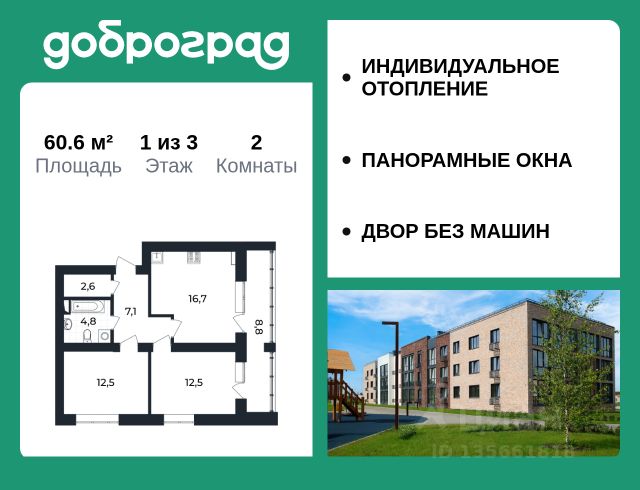 Продается 3-к квартира 88 кв.м. С ПРЕДЧИСТОВОЙ ОТДЕЛКОЙ в новом построенном доме по адресу: Владимирская область, Доброград, улица Долголетия, д.2, корп. 1. Дом монолитно-блочный, в квартире предусмотрено ИНДИВИДУАЛЬНОЕ ОТОПЛЕНИЕ двухконтурным газовым котлом, что позволяет значительно экономить на коммунальных платежах. Квартира находится на 3 этаже 5-этажного дома. На лестничной площадке предусмотрена собственная КЛАДОВАЯ (келлер) для хранения вещей. В доме есть ЛИФТ, сквозной подъезд с просторной входной группой, большая колясочная.Функциональная планировка, большая кухня-гостиная, эффектная лоджия с ПАНОРАМНЫМ ОСТЕКЛЕНИЕМ, гардеробная помогут грамотно организовать пространство. Отделка квартиры включает в себя: - пол - полусухая стяжка, - стены подготовлены под поклейку обоев, - электроразводка, выводы для освещения, - разводка сантехнических и водопроводных труб, канализации, - ванная - гидроизоляция пола, штукатурка стен, - откосы из ГВЛ, подоконники из ПВХ, - лоджия - выводы для освещения, розетки и выключателя. ДОМ СДАН! Рядом расположен живописный природный парк, озеро, места для отдыха и прогулок, качественные игровые площадки. Доброград - это превосходная экология и современная инфраструктура всего в 2,5 часах от Москвы. В городе работает современный образовательный комплекс "МИР" (частная школа и детский сад), муниципальная гимназия. В 2026 году состоится открытие государственного детского сада и физкультурно-оздоровительного комплекса с бассейном. Медицинское обслуживание обеспечивает Первый клинический медицинский центр, расположенный в 12 километрах от Доброграда, а в самом Доброграде работает кабинет врача общей практики. Территория охраняется, въезд строго по пропускам, что гарантирует безопасность Вам и Вашей семье. В Доброграде организованы необходимые условия для занятий спортом круглый год: - оборудованные площадки для самых популярных видов спорта, - крытый спортивный комплекс, - первое в регионе 9-луночное гольф-поле, - скейт-парк, - веревочный парк, - освещенные лыжные и велосипедные трассы, - крупнейший в Европе вейк-парк. Город обслуживает собственная управляющая компания, которая обеспечивает бесперебойную работу всех систем, чистоту и порядок на территории. Квартиру можно приобрести за наличную оплату, в ипотеку, а также с рассрочкой от застройщика. Условия ипотеки и рассрочки уточняйте у менеджеров отдела продаж.