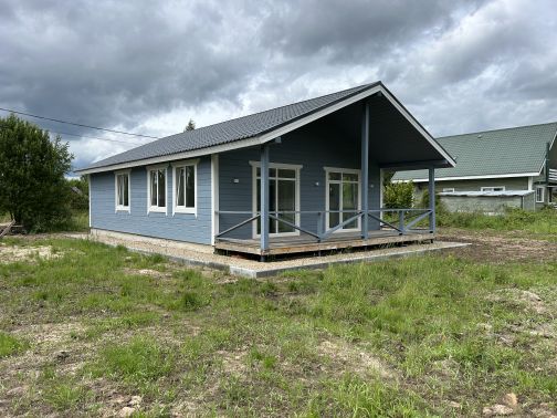 Планировка дома: прихожая, котельная, большая кухня-гостиная с панорамными окнами и выходом на террасу, три спальни, совмещенный санузел с готовым ремонтом.
