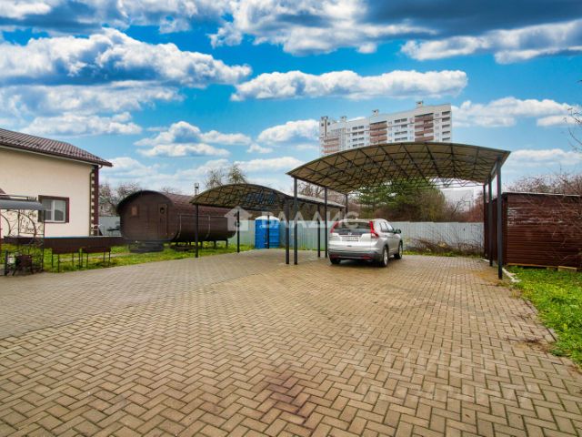 Участок огорожен металлическим забором по периметру (задняя часть сетка-рабица и живая изгородь). На въезде автоматические откатные ворота, с выделенной зоной парковки под навесом на металлических опорах. Участок ухоженный, засажен плодовыми деревьями и кустарниками.