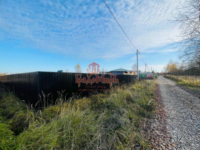 Земельный участок огорожен комбинированным забором. Часть забора, где планируется дом, огорожена металлическим профнастилом, а часть участка под сад и огород сеткой рабицей. Весь забор выполнен в одной цветовой гамме чёрного цвета.