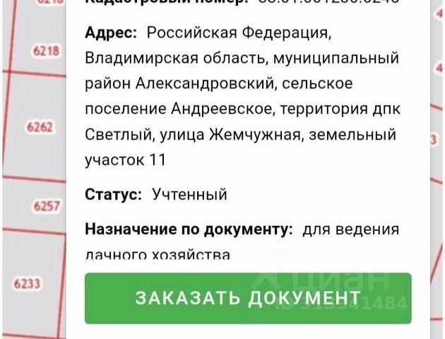 ХОРОШИЙ УЧАСТОК 6 СОТОК С КОММУНИКАЦИЯМИ ПО ГРАНИЦЕ В ДПК СВЕТЛЫЙ - РЯДОМ С ГОРОДОМ АЛЕКСАНДРОВ АДРЕС: улица Чехова, ДПК Светлый, вблизи поселка Светлый, деревни Вески и города Александров, Владимирская область, 100 км от МКАД по Ярославскому шоссе или 120 км по Щелковскому шоссе. ОБ ОБЪЕКТЕ: Земельный участок 6 соток трапециевидной формы, немного под склон ( данный фактор обеспечивает сухость ), отмежёван, границы установлены, не огорожен. Категория земель - Земли сельскохозяйственного назначения. Вид разрешенного использования: для ведения дачного хозяйства. Возможно строительство жилого дома - прописка, регистрация и т.д. Кадастровый номер земельного участка - 33:01:001230:3580 КОММУНИКАЦИИ: Электричество по границе участка - подключение платное по гос. программе - возможно подключить 15 кВт 380/220 Вольт. Газ доведён до границы участка ( за это было оплачено 40.000 рублей ), для того что бы завести в строение оно должно быть зарегистрировано. Центральный водопровод по границе участка - стоимость подключения 100.000 рублей, возможен расчёт за подключение водопровода частями ( в рассрочку ). Интернет по границе. ДОКУМЕНТЫ: Участок в собственности менее трёх лет, два совершеннолетних собственника. Документ основания: договор купли-продажи. ДОРОГА: Подъезд отличный, круглогодичный - грунтовая дорога отсыпанная щебнем. Зимой дороги чистятся. МЕСТОРАСПОЛОЖЕНИЕ: Координаты для самостоятельного местонахождения объекта недвижимости - 56.421224 38.788707 ИНФРАСТРУКТУРА: ДПК Светлый насчитывает около 700 участков. В ДПК Светлый развитая инфраструктура. Членские взносы в ДПК Светлый: 3 месяца - 1800 рублей. Участки активно раскупаются и застраиваются. Территория ДПК Светлый огорожена и охраняется. Рядом расположена деревня Вески, которая примыкает к поселку Светлый и насчитывает около 500 домов, участков. Часть владельцев домов живут круглогодично. Рядом с ДПК находится конно-спортивная школа. Магазины, автобусная остановка в шаговой доступности в п. Светлый. Регулярное автобусное сообщение с городом Александров, который находится в 1 км от поселка Светлый. Город Александров насчитывает около 90 000 местного населения, развитая инфраструктура, прямое сообщение с городом Москва. Прекрасный вариант для постоянного проживания или загородного отдыха. ВАЖНО: Можно построить и зарегистрировать жилой дом (прописка, постоянное место жительства). Возможно приобретение с помощью средств ИПОТЕЧНОГО КРЕДИТОВАНИЯ. ДЛЯ ПОЛУЧЕНИЯ БОЛЕЕ ПОДРОБНОЙ ИНФОРМАЦИИ ОБ ОБЪЕКТЕ НЕДВИЖИМОСТИ СМОТРИТЕ ВИДЕОРОЛИК.
