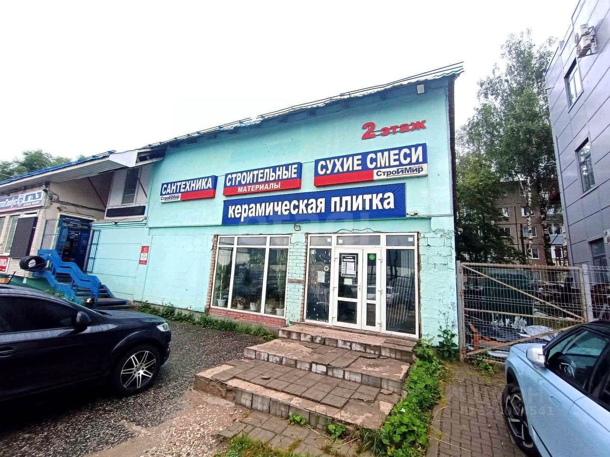 В здании несколько магазинов - автозапчасти, строительные материалы.