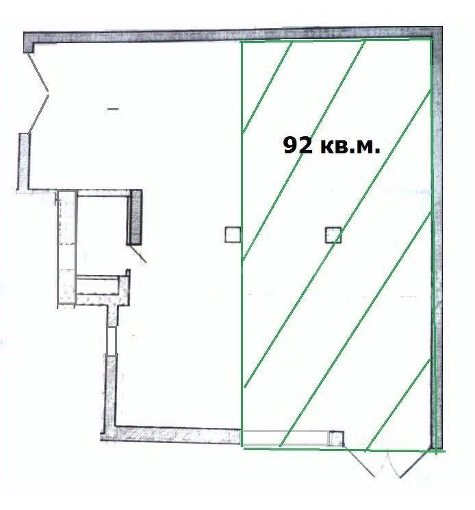 Площадь помещения 92 кв.м., высота потолков 4 метра, помещение правильной почти квадратной формы, свободной планировки, на колоннах.