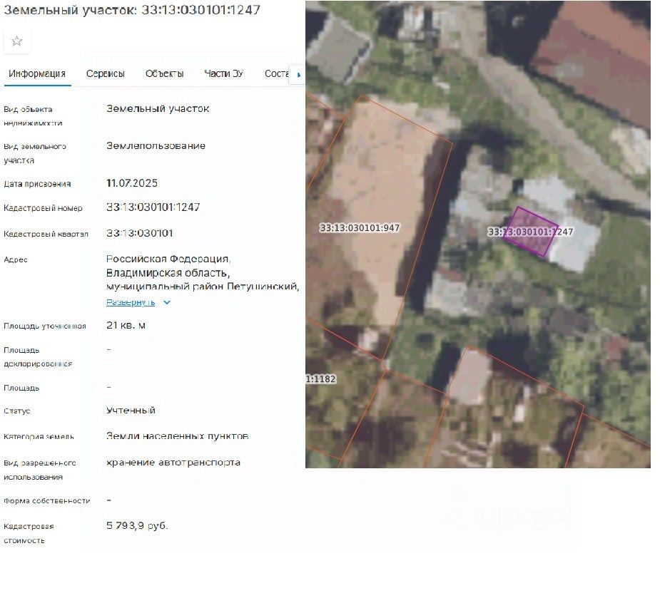 земельный участок с кадастровым номером 33:13:030101:1247, площадью 21 кв.м, расположенный по адресу: Российская Федерация, Владимирская область, муниципальный район Петушинский, городское поселение город Покров, поселок Введенский, категория земель земли населённых пунктов, вид разрешенного использования хранение автотранспорта