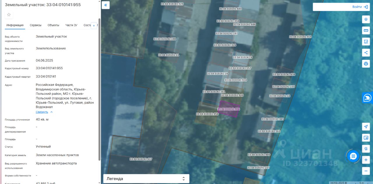 Земельный участок с кадастровым номером 33:04:010141:955, местоположение: Российская Федерация, Владимирская область, Юрьев-Польский район, МО г. Юрьев-Польский (городское поселение), г. Юрьев-Польский, ул. Луговая, район Водоканал