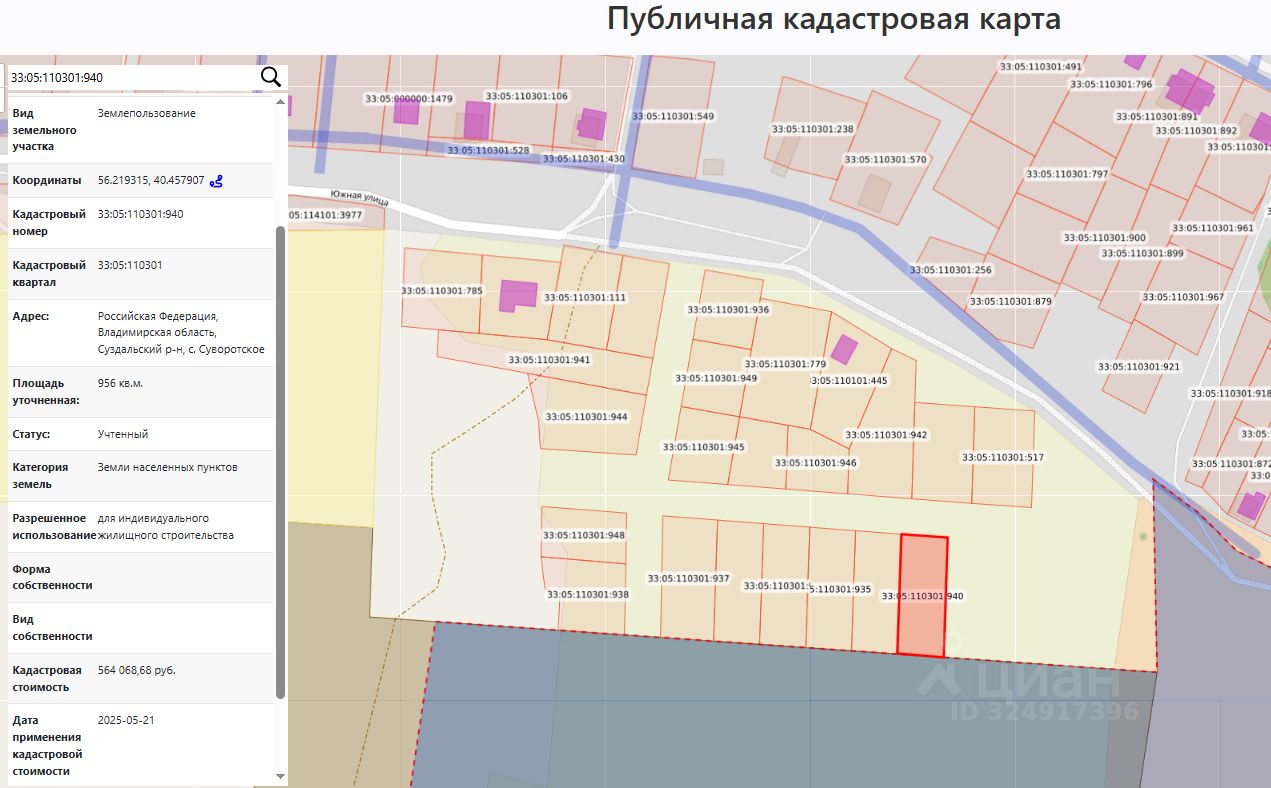 Продажа права аренды сроком на 20 (двадцать) лет земельного участка из земель населенных пунктов общей площадью 956 кв. м, с кадастровым номером 33:05:110301:940, местоположение: Российская Федерация, Владимирская область, р-н Суздальский, МО Боголюбовское (сельское поселение), с. Суворотское (далее Участок) с разрешенным использованием: для индивидуального жилищного строительства.