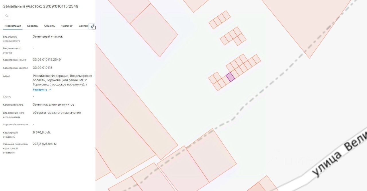 Земельный участок из категории земель населенных пунктов с кадастровым номером 33:09:010115:2549, вид разрешенного использования - объекты гаражного назначения, площадь: 24 кв.м, местоположение: Владимирская область, Гороховецкий р-н, МО г. Гороховец (городское поселение), г.Гороховец, ул. Сиреневая
