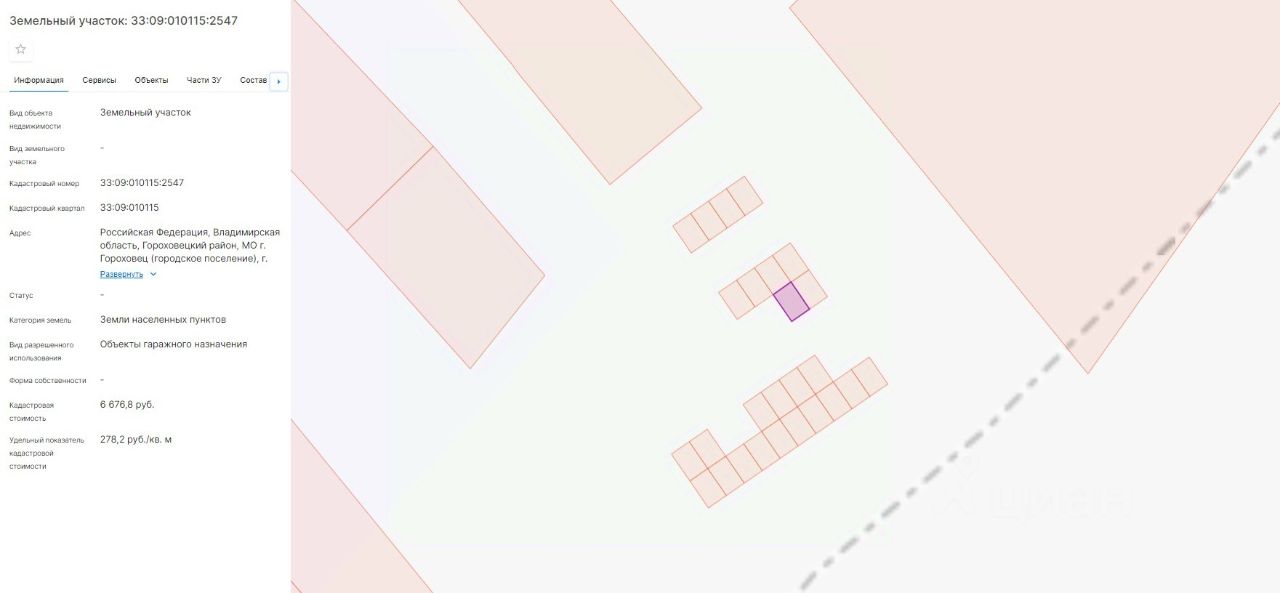 Земельный участок из категории земель населенных пунктов с кадастровым номером 33:09:010115:2547, вид разрешенного использования - объекты гаражного назначения, площадь: 24 кв.м, местоположение: Владимирская область, Гороховецкий р-н, МО г. Гороховец (городское поселение), г.Гороховец, ул. Сиреневая
