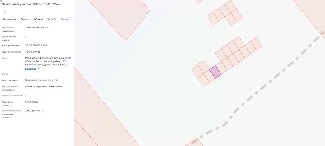 Земельный участок из категории земель населенных пунктов с кадастровым номером 33:09:010115:2548, вид разрешенного использования - объекты гаражного назначения, площадь: 24 кв.м, местоположение: Владимирская область, Гороховецкий р-н, МО г. Гороховец (городское поселение), г.Гороховец, ул. Сиреневая