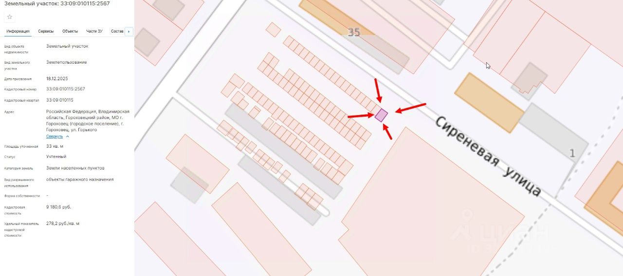 Земельный участок из категории земель населенных пунктов с кадастровым номером 33:09:010115:2567, вид разрешенного использования - Объекты гаражного назначения, площадь: 33 кв.м, местоположение: Российская Федерация,Владимирская область,Гороховецкий район, МО г. Гороховец (городское поселение), г. Гороховец, ул. Горького