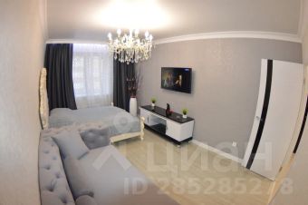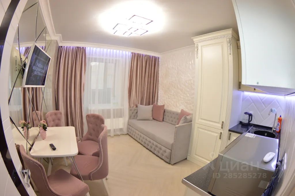 В кухне-гостиной удобный раскладной диван, напротив зеркальное панно с TV, установлена вся необходимая техника: холодильник, микроволновка, электрический чайник, стиральная машина, варочная панель, все необходимые кухонные принадлежности.