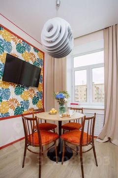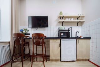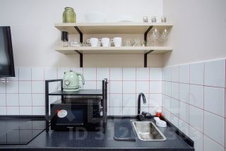 Кухонная зона оформлена в свежих и ярких цветах, подчёркивающих её современность и функциональность. Здесь вы найдёте всё необходимое для приготовления пищи: электрическую плиту, микроволновую печь, компактный холодильник, чайник и всю необходимую посуду. Обеденная зона включает небольшой стол и удобные стулья, делая каждую трапезу приятной.
