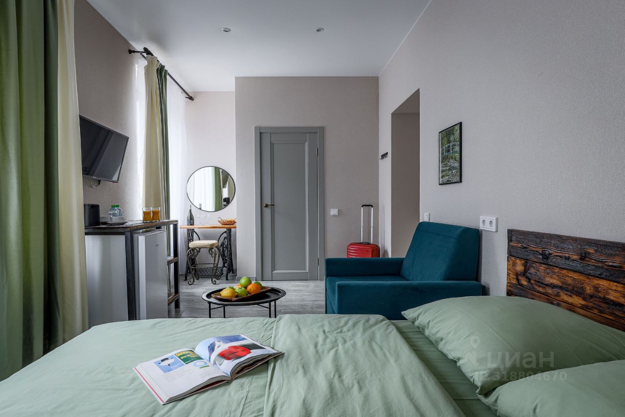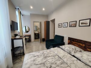 Трёхместный улучшенный номер с кондиционером. В номере двуспальная кровать, кресло-кровать, кухонный уголок с холодильником, микроволновкой, чайником, посудой. Телевизор, фен, косметические принадлежности. Санузел с душевой. Гостям предоставляется приветственный набор воды, чая, кофе.