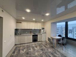 В квартире есть все необходимое для комфортного проживания - кухонный гарнитур с техникой, раскладывающийся диван, большой телевизор, обеденная зона, стиральная машина, большой шкаф-купе.