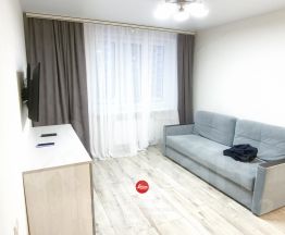 Сдается уютная однокомнатная квартира с евроремонтом на 7 этаже 12-этажного дома. Площадь квартиры составляет 38,3 кв. м, из которых 12 кв. м занимает кухня. Высота потолков — 2,6 метра.