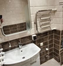 В квартире есть все необходимое для комфортного проживания: современная мебель на кухне и в комнате, а также вся необходимая техника — холодильник, телевизор и стиральная машина. Отдельный кран для питьевой воды с системой очистки.